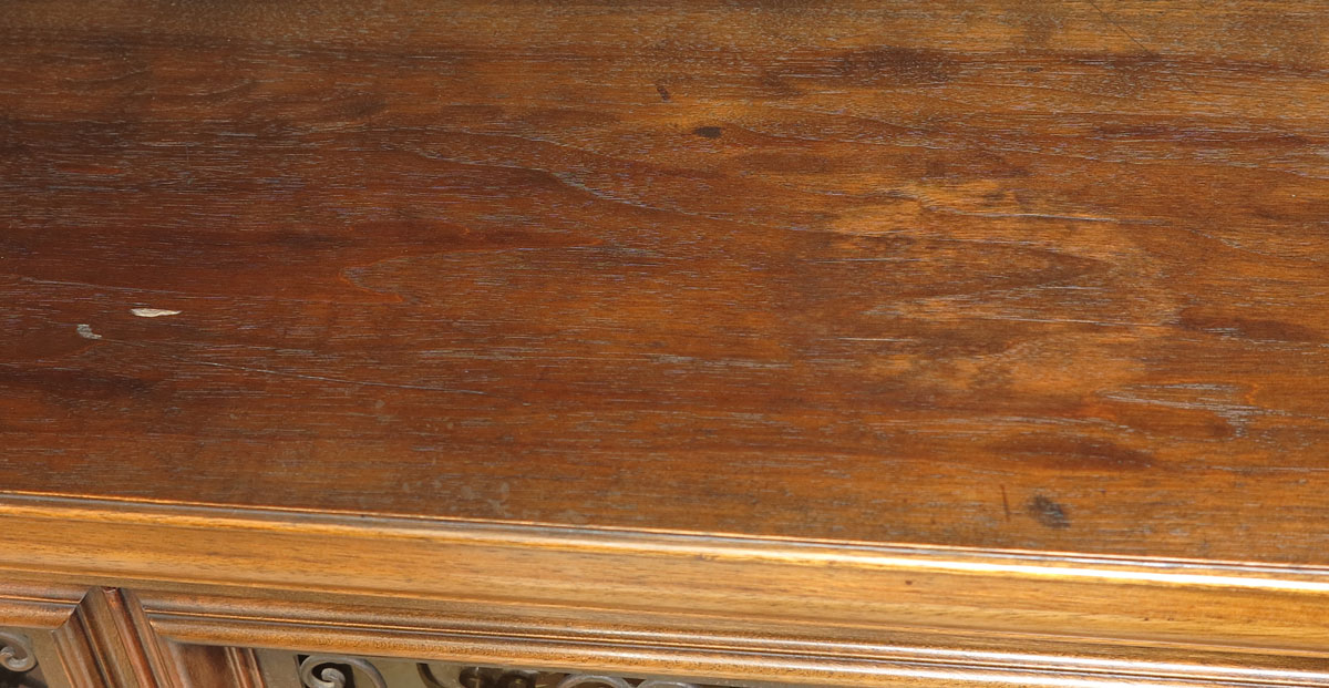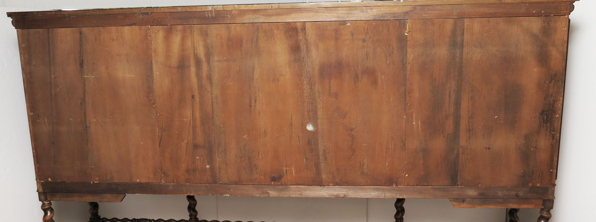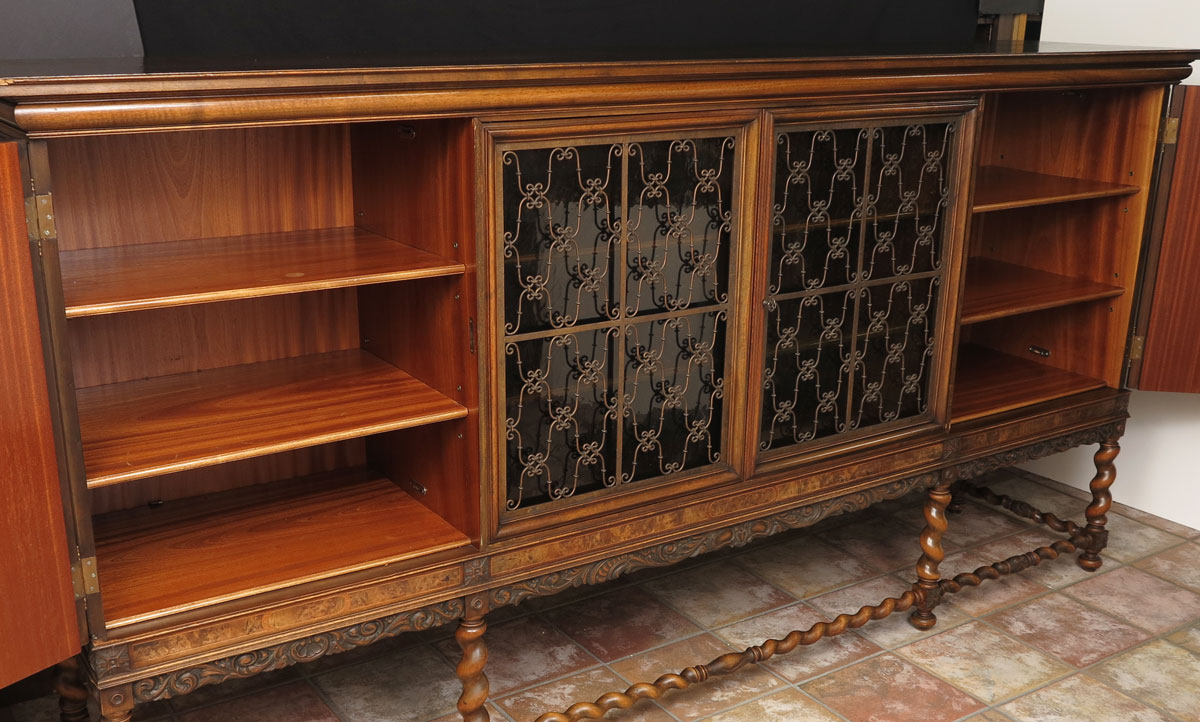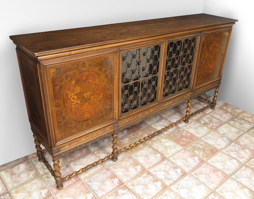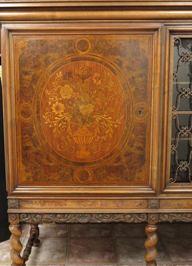 ITALIAN MARQUETRY INLAID BOOKCASE CURIO: 4 doors, central doors glass with iron decoration, side doors with floral marquetry inlay and burlwood veneer. Carved skirt, barley twist legs and stretchers. Measures 54'' h. x 106'' x 22 1/2''.