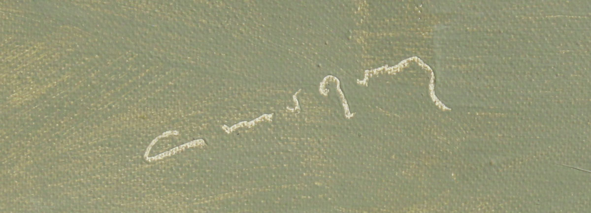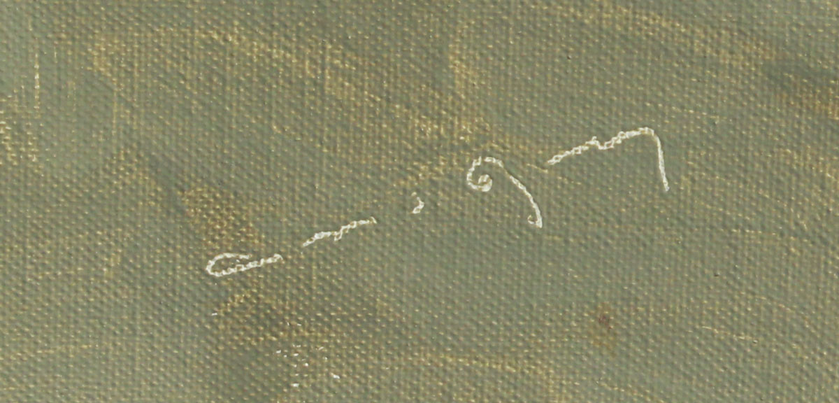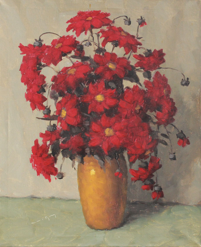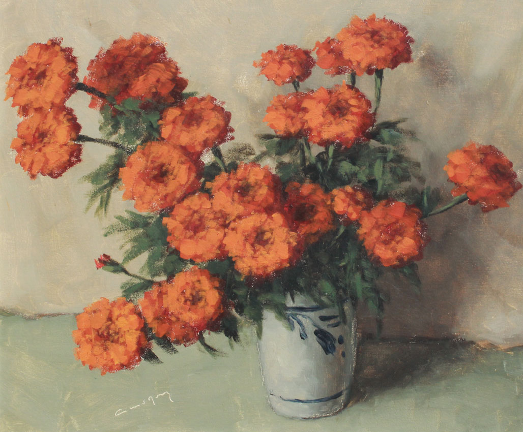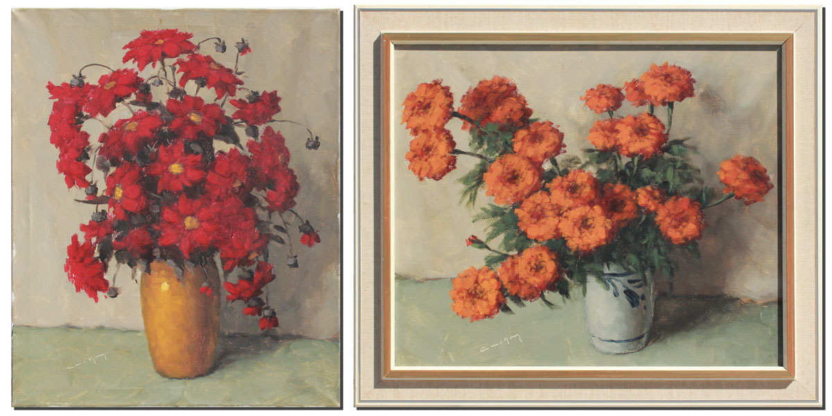 PAIR OF ILLEGIBLY SIGNED FLORAL STILL LIFE PAINTINGS: 1) Red Flowers in a Mustard Colored Vase, Oil/Canvas, 23 1/2'' x 19 1/2'', signed lower left, C. Vanderge?, unframed. 2) Orange Flowers in a Delft Style Blue & White Vase, Oil/Canvas, 19 3/4'' x 23 1/2''.