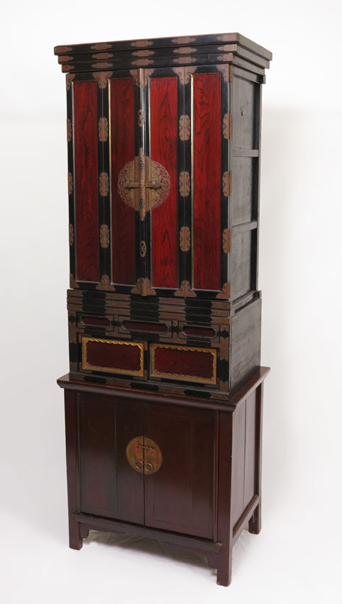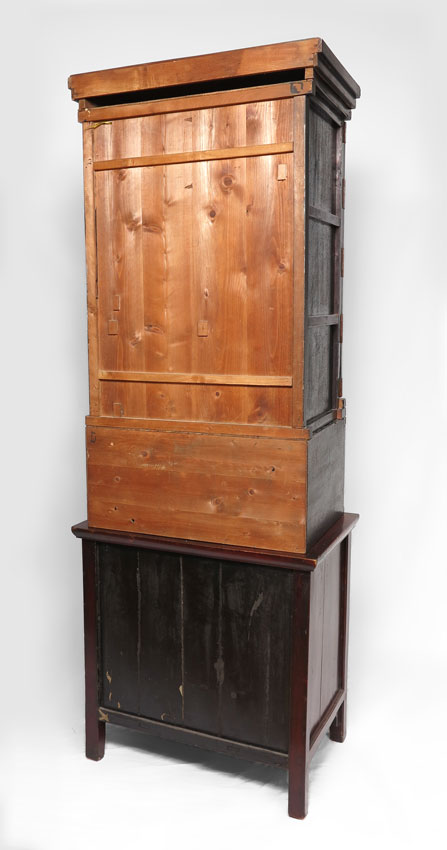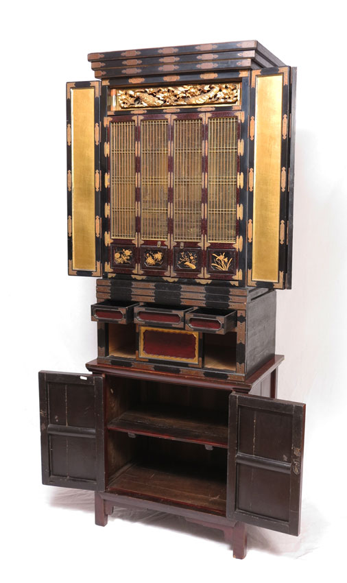 ORIENTAL ALTAR CABINET / SHRINE: Three part with the upper section having compartmented gilt lacquer interior behind the folding doors. Rests on a two door base cabinet. Measures overall 7'1'' tall x 31.5'' x 20.5''.