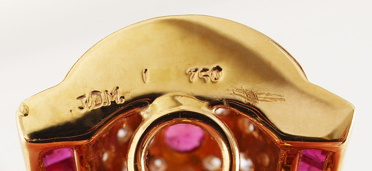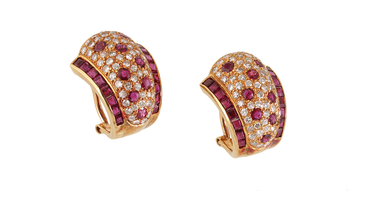 18K DIAMOND & RUBY EARRINGS: 18K yellow gold earrings contain 123 round brilliant cut diamonds totaling approx. 3.25 Ct. (One diamond is missing). The diamonds average VVS in clarity and G-H in color. 16 round mixed cut and 32 square calibre cut rubies totaling approx. 3.50 Ct. The rubies average VS in clarity (Type II), stpR in Hue, 5 in Tone and 4 in Saturation. The diamonds are pave set. The rubies are pave and channel set. Post and hinged clip closures. Weight: 19.5 grams.