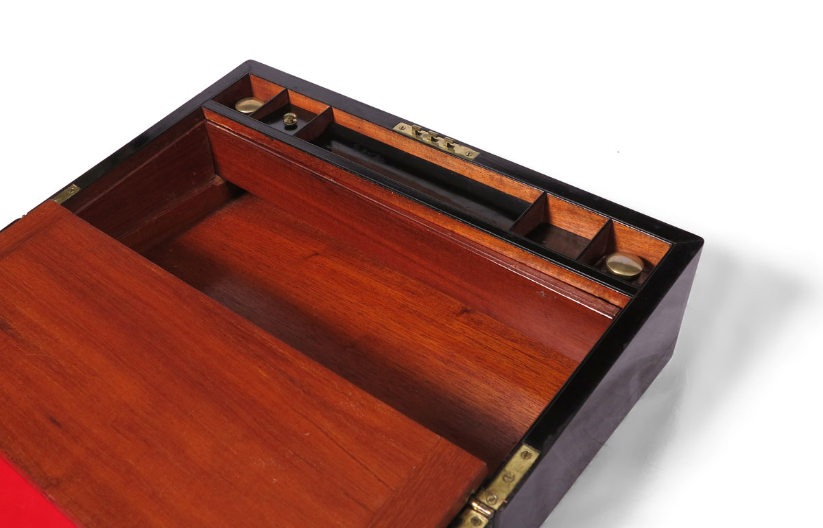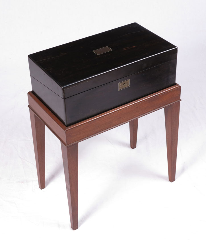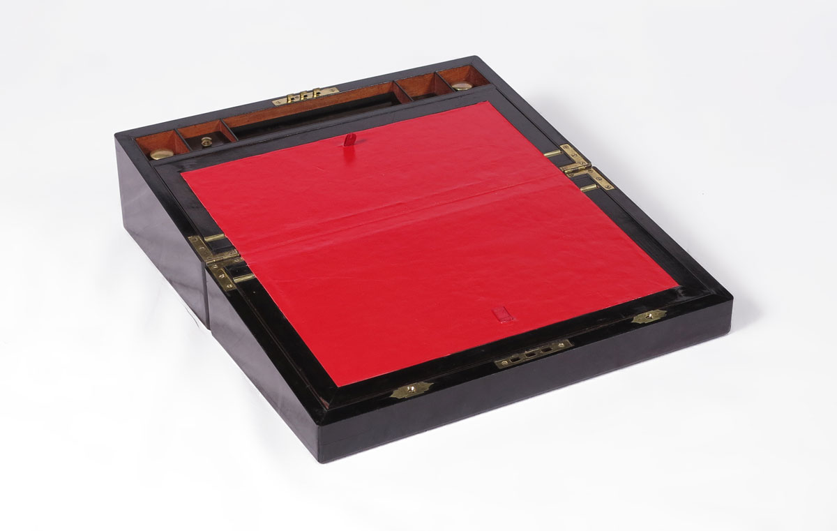 EBONIZED LAP DESK ON STAND: Fitted interior with red writing surface, pen tray, ink bottle, stamp box and storage. Key locking (key included). The box measures 6 1/2'' x 18'' x 10''. On the stand they are 24 1/2'' tall.