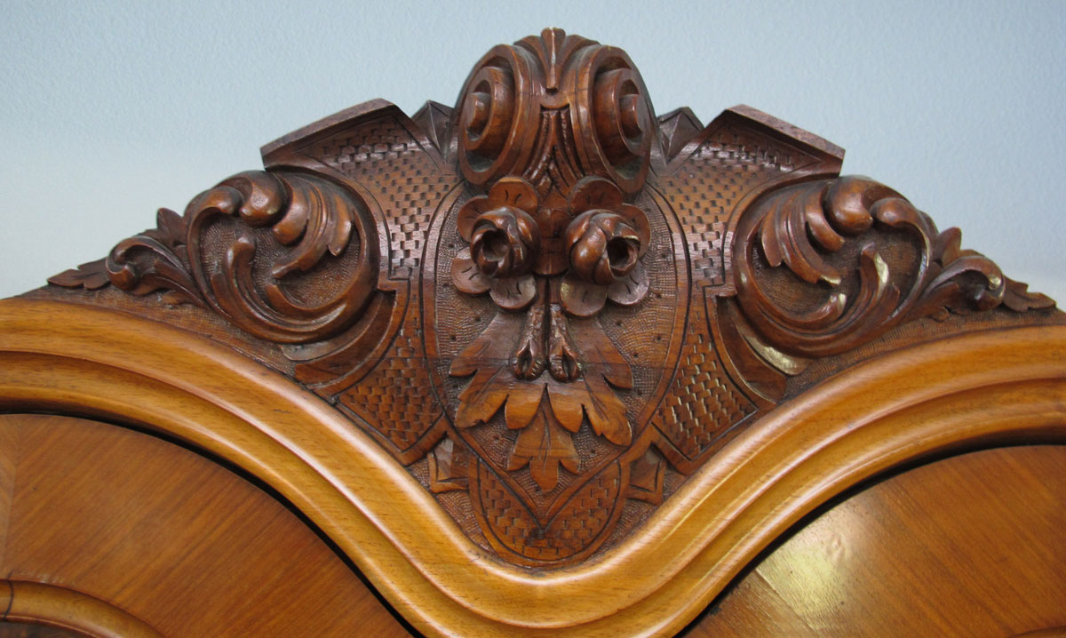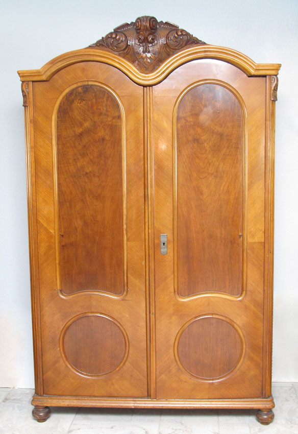 CARVED FRENCH ARMOIRE: Carved crest, shaped top, 2 paneled doors. 80'' h. x 50 1/2'' x 23''. See matching armoire next lot 94.