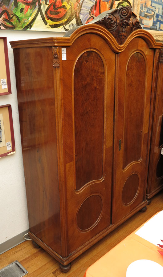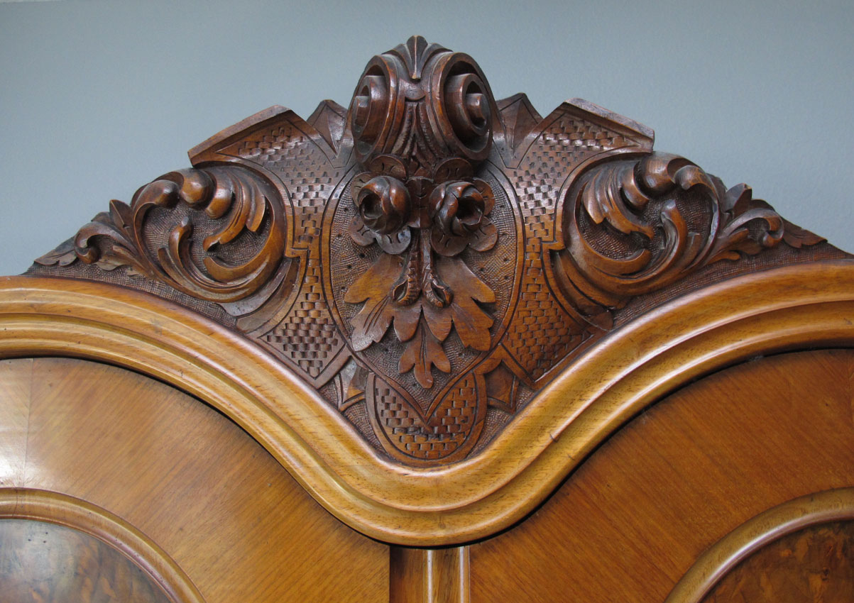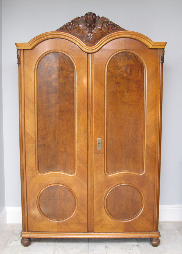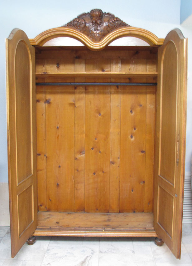 CARVED FRENCH ARMOIRE: Carved crest, shaped top, 2 paneled doors. 80'' h. x 50 1/2'' x 23''. See matching armoire previous lot 93.