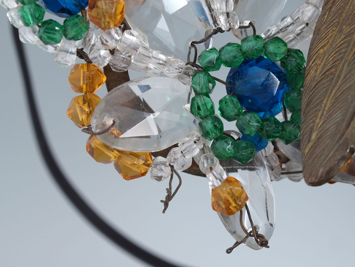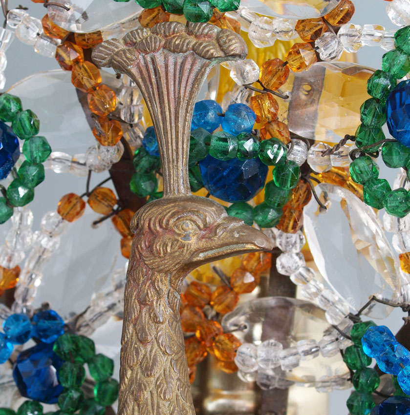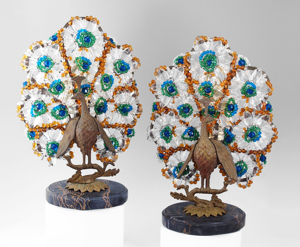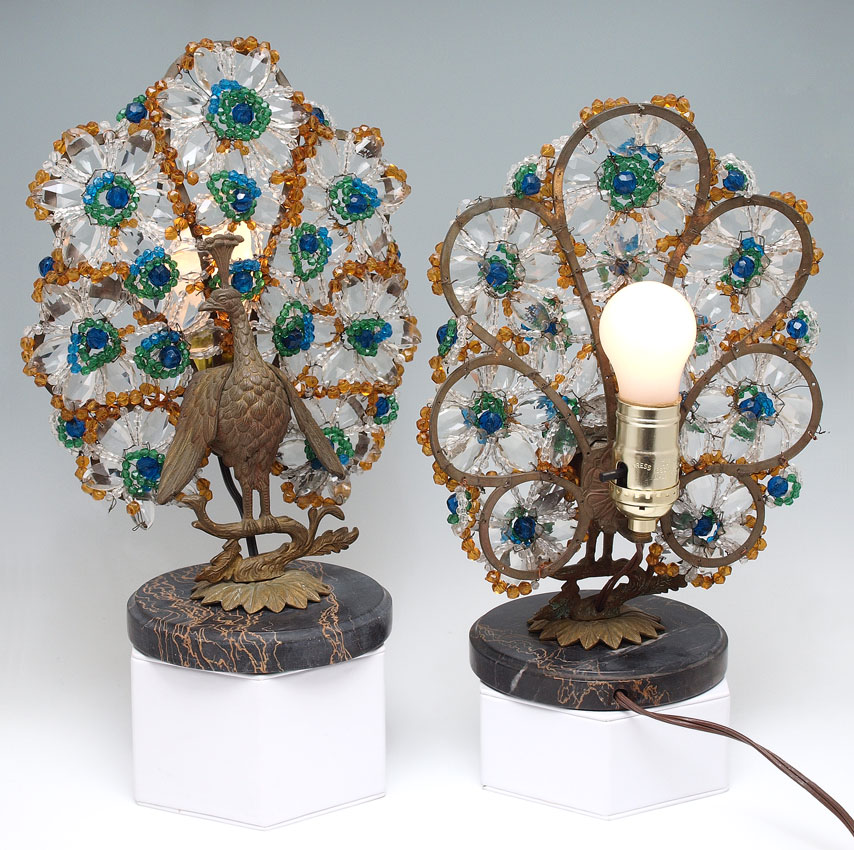 PAIR CZECH ART DECO PEACOCK LAMPS: Signed ''Made in Czechoslovakia''. An unheard of matched pair, right and left facing. Brass body with faceted glass beaded tail, round black marble plinth. Measures 12'' tall x 10'' x 5''.