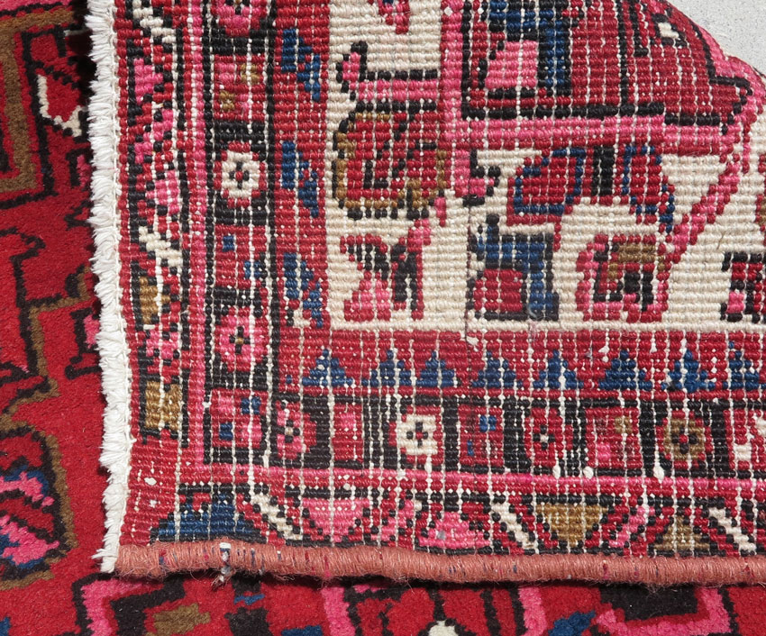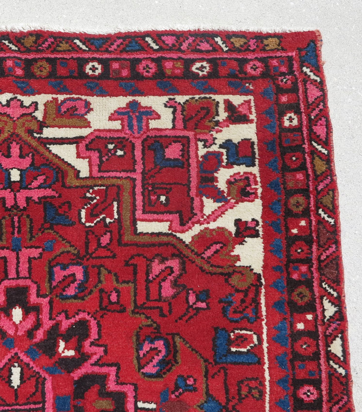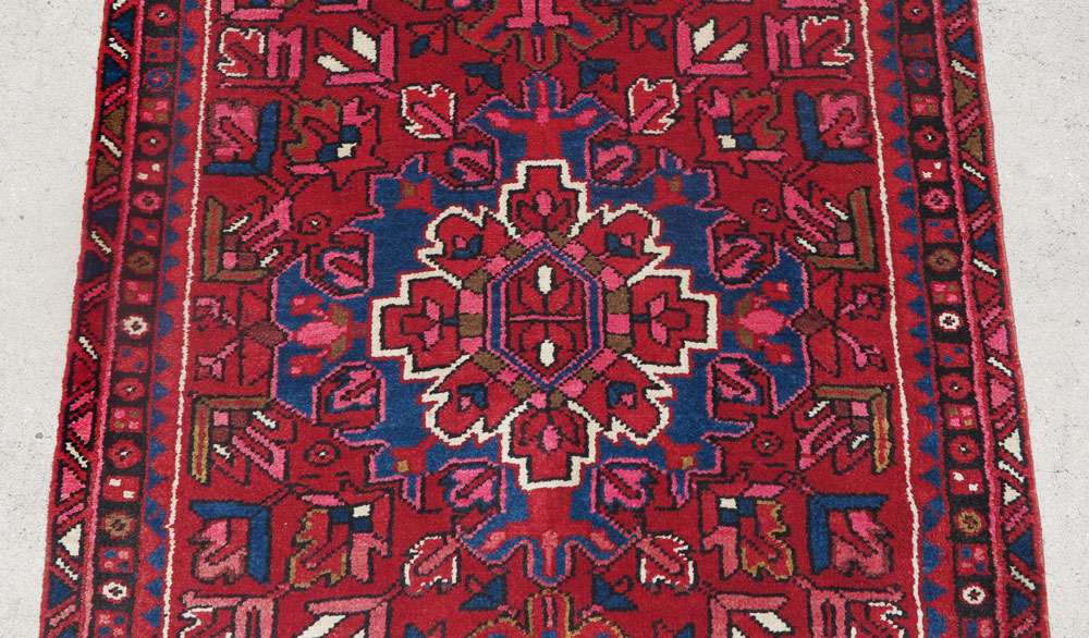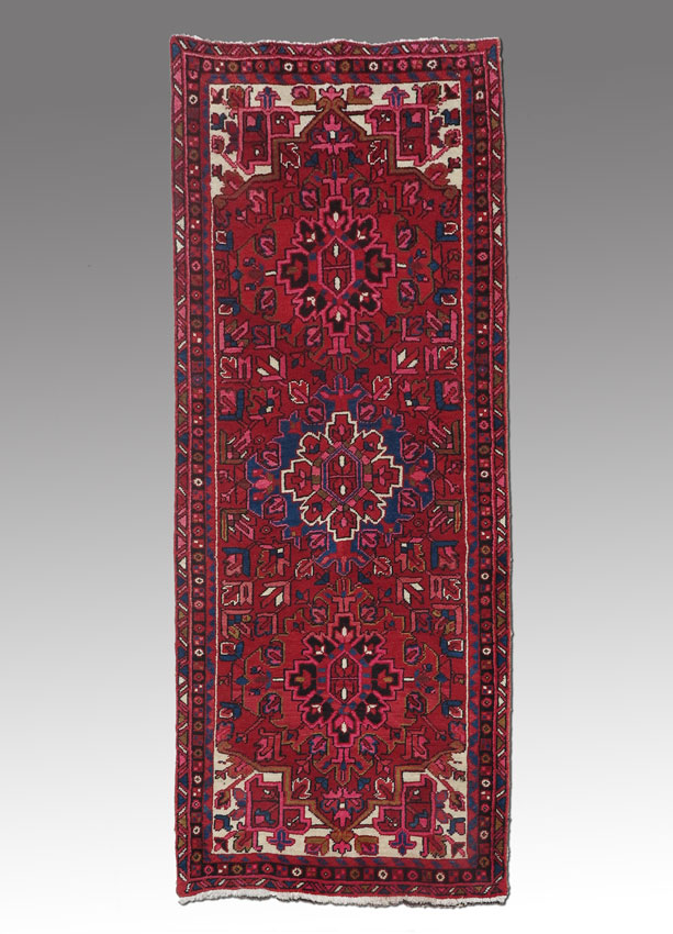 MODERN PERSIAN KARAJA HAND KNOTTED WOOL RUG, 2'10'' x 6'10'': This brightly colored runner has traditional Karaja motifs with three central medallions in alternating colors. The hot pink against the red, black, and white adds a lot of vibrancy to this rug. Condition is good.