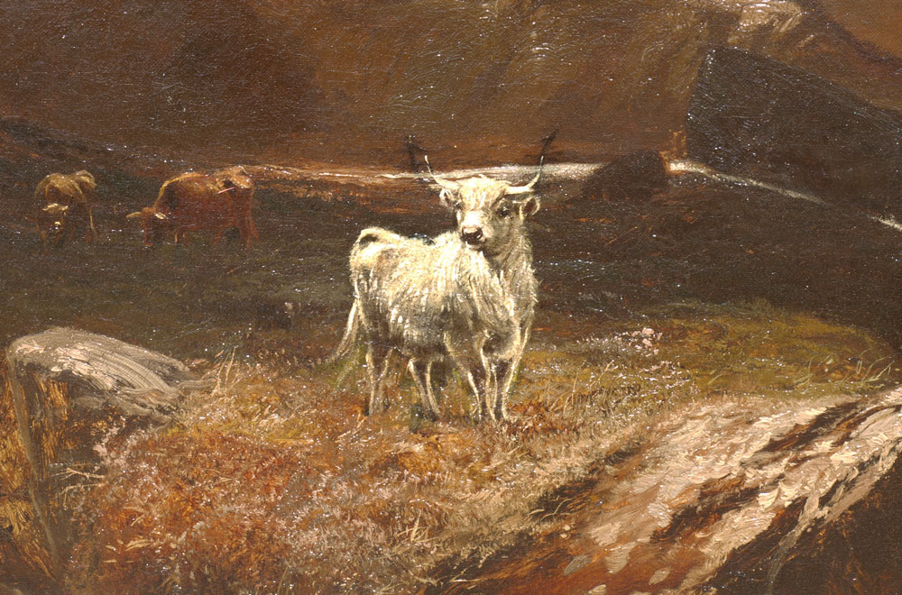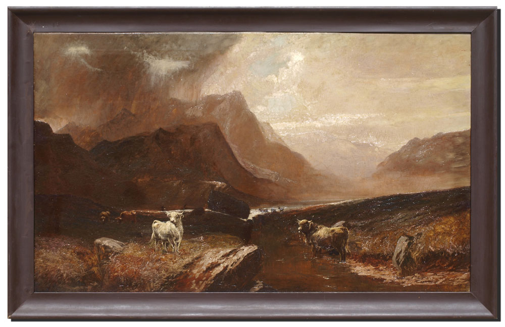 LARGE OIL/CANVAS HIGHLAND LANDSCAPE WITH CATTLE: Possibly Sidney Richard Percy, 30 1/8'' x 50'', no visible signature, encased in a reconditioned period frame with wear and crackling to the finish, 36'' x 56''.