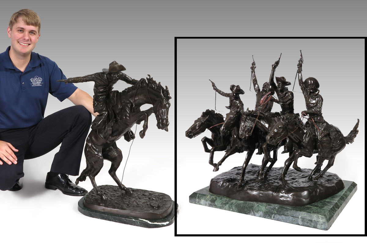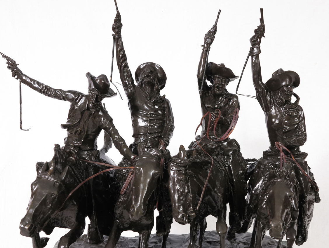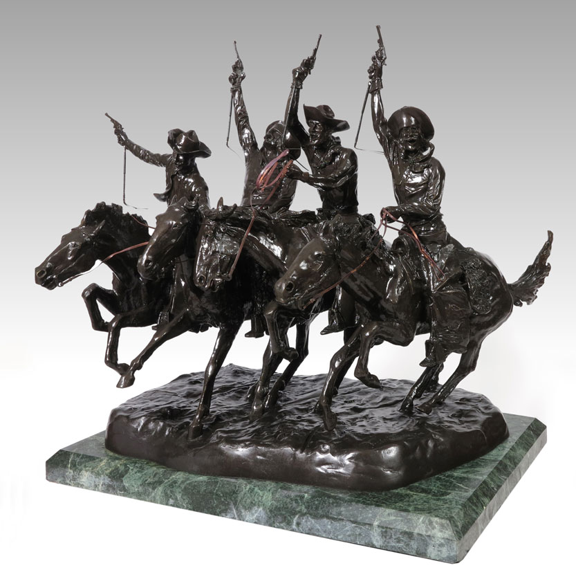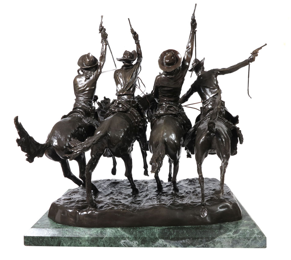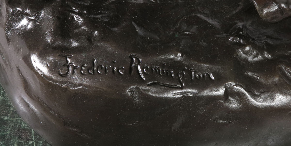 LARGE ''COMING THROUGH THE RYE'' BRONZE AFTER REMINGTON: An earlier casting measures approximately 27 1/2'' in height, 27'' in width and 25'' in depth, affixed to a green variegated beveled marble plinth which is 2'' thick 29'' wide, 20 1/2'' deep.