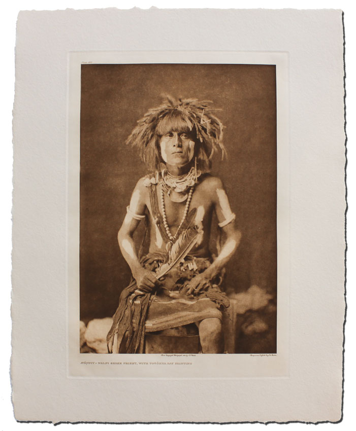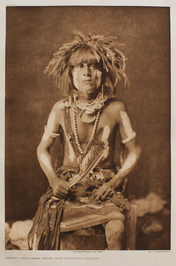 CURTIS, Edward, (American, 1968-1952): ''Honovi-Walpi Snake Priest, Totokya Day Painting'', titled lower left, marked plate 408 upper left, from copyright photograph 1921 by E.S. Curtis, photogravure by Sussex England Company of Boston, printed on Classic Paper, unframed. Finely printed from the original plate in 1982 by master printmaker, author and teacher Deli Sacilotto, edition size less than 15.
