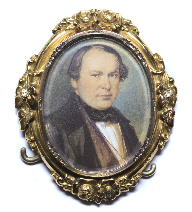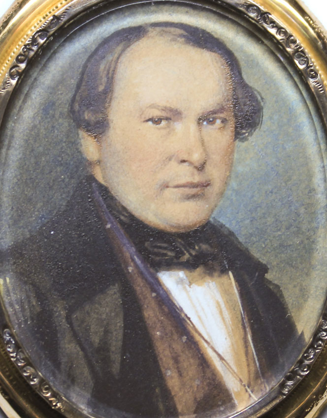 EXCEPTIONAL 19TH CENTURY MINIATURE PORTRAIT PAINTING: Portrait of a Gentleman, Watercolor, sight size 1 1/2'' oval x 1 1/8'', encased in 10K gold filled foliate motif frame, 2 1/4'' x 1 3/4''.