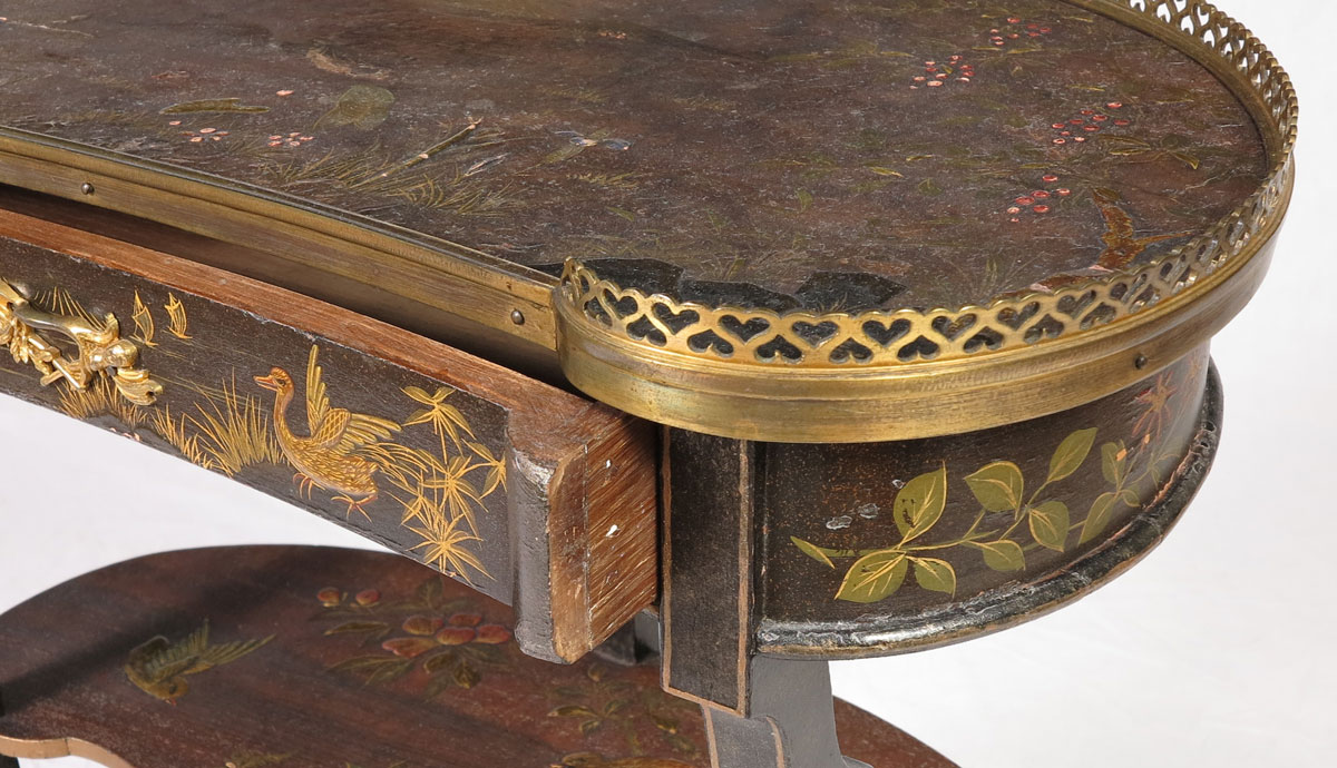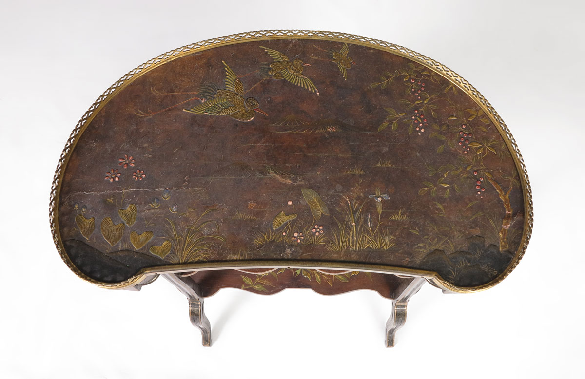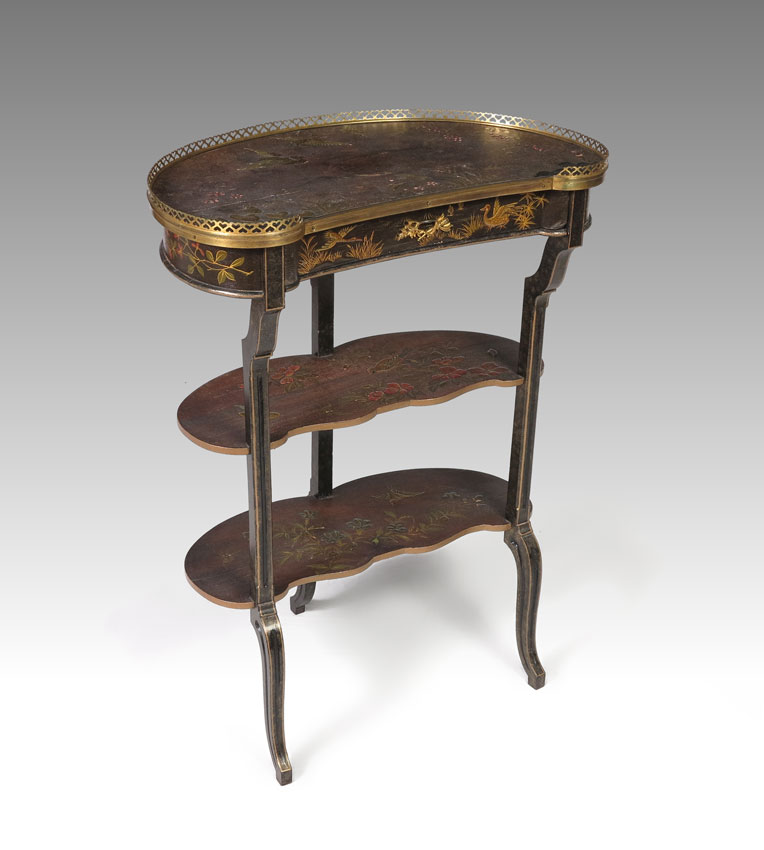 CHINOISERIE DECORATED KIDNEY SHAPE TIERED TABLE: Top decorated with inlay and chinoiserie decoration of cranes in flight and foliate motifs, pierced gallery over single drawer. 2 lower shelves with bird and foliate decoration, on 3 carved and shaped legs. 29 1/4'' h. x 22'' x 12 1/2''.