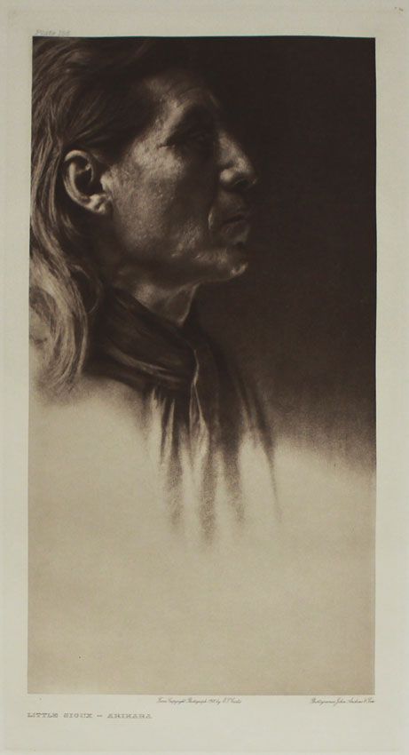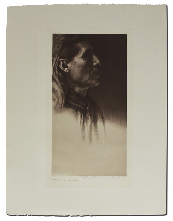 CURTIS, Edward, (American, 1868-1952): ''Little Sioux-Arikara,'' Photogravure, 23 1/4'' x 18 3/4'', titled lower left, plate 155 upper left, from copyright photograph 1908 by E. Curtis, photogravure by John Andrew & Sons, unframed. Finely printed from the original plate in 1982 by master printmaker, author and teacher Deli Sacilotto, edition size less than 15.