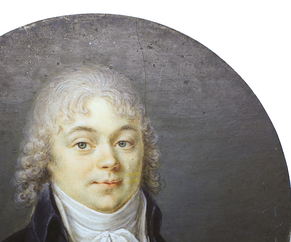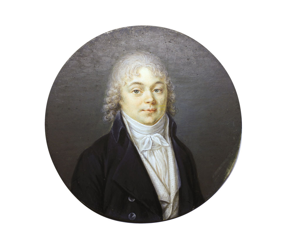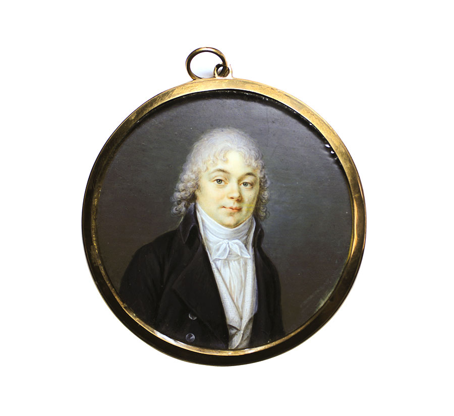 MINIATURE IVORY PORTRAIT PAINTING OF A GENTLEMAN: Circular sight size, 2 1/2'' in diameter, no visible signature, most likely 19th Century, encased in a gilt metal frame with some wear, 2 3/4'' in diameter.