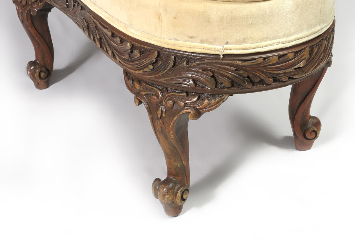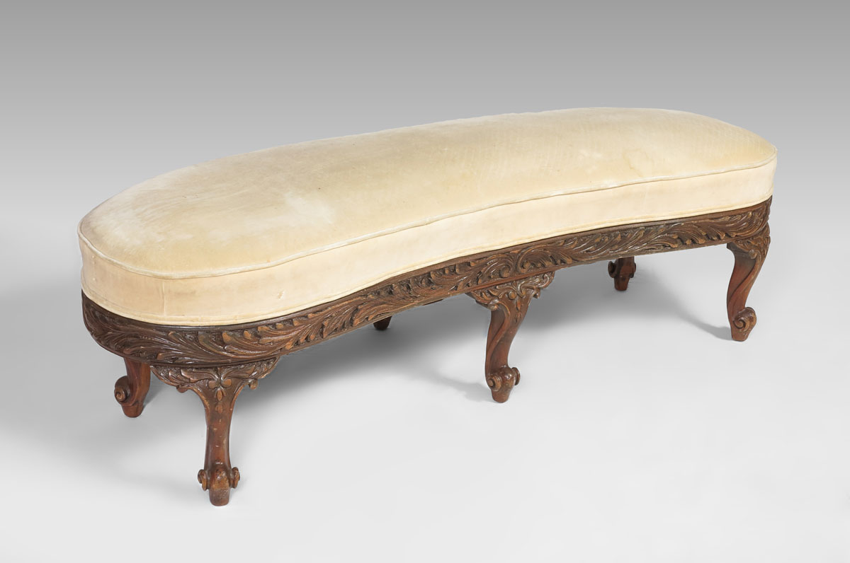 CARVED FRENCH BENCH: Foliate motif carved skirt, on 6 carved legs. Ivory velvet upholstery. 19 1/2'' h. x 59 1/2'' x 18 1/2''.