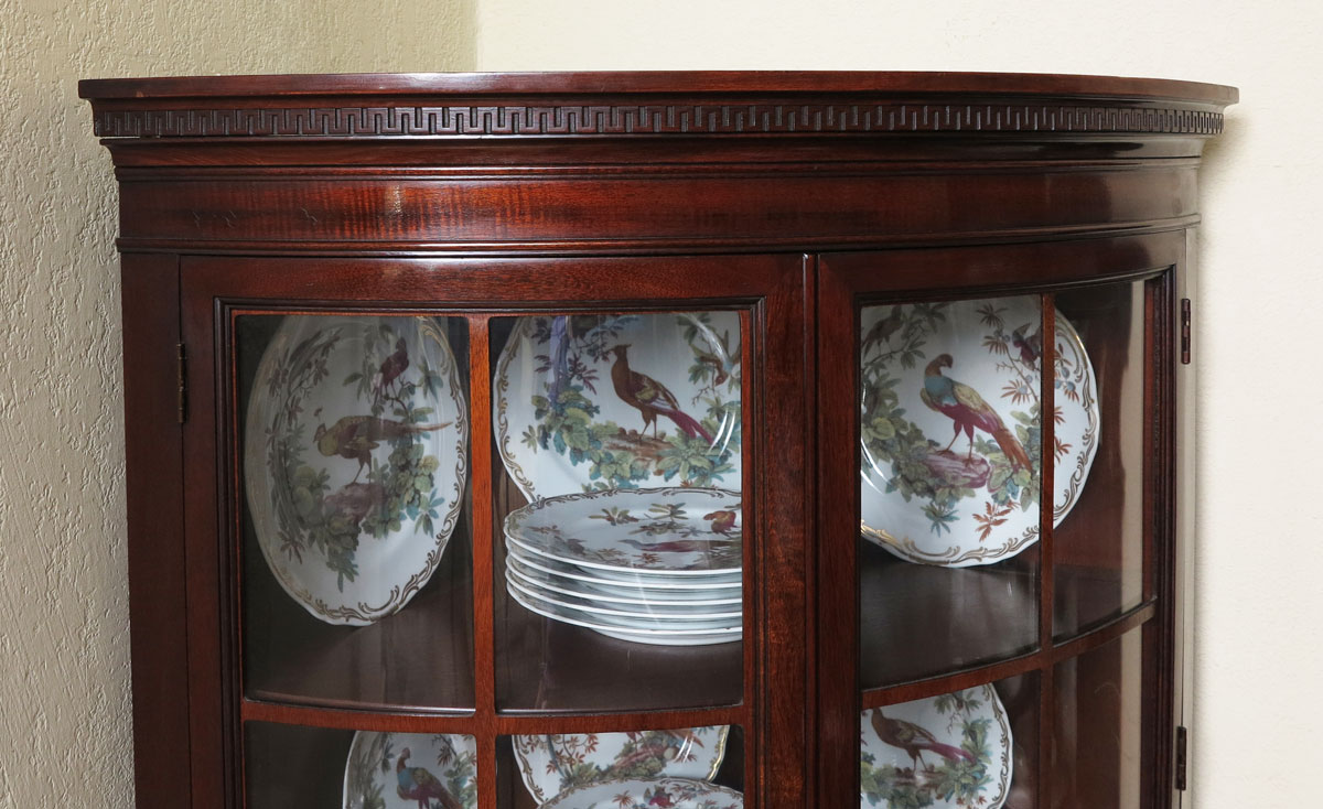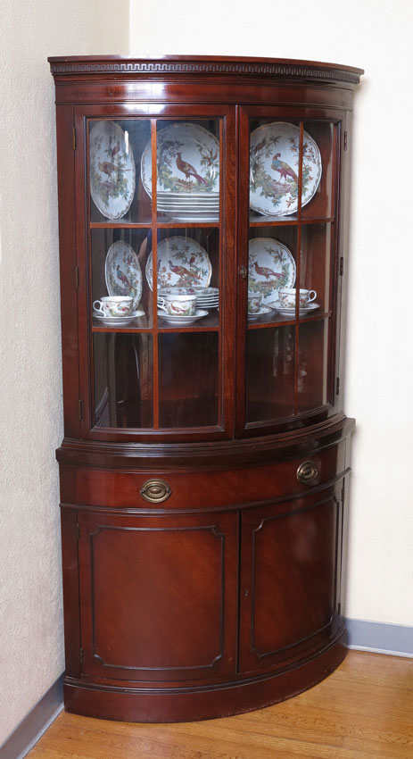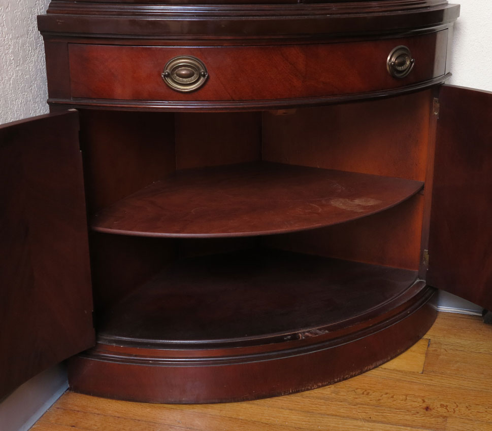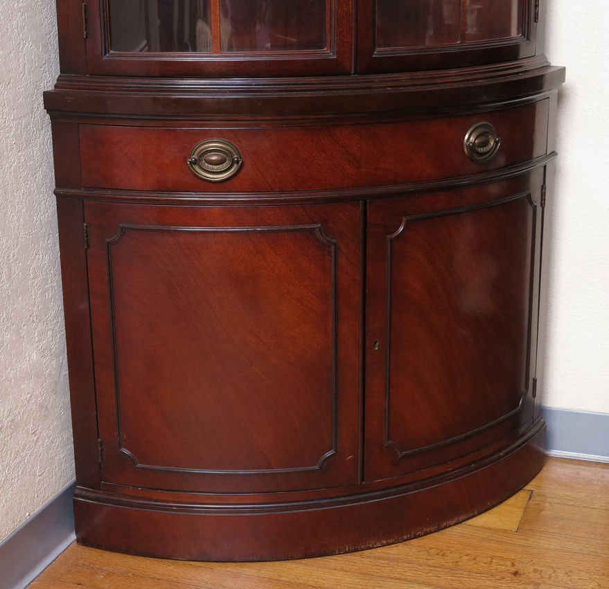 DREXEL TRAVIS COURT MAHOGANY CORNER CABINET: Greek key molding, curved front with 2 glass doors over drawer over 2 doors. 70'' h. x 35 /8'' x 20 3/4''.