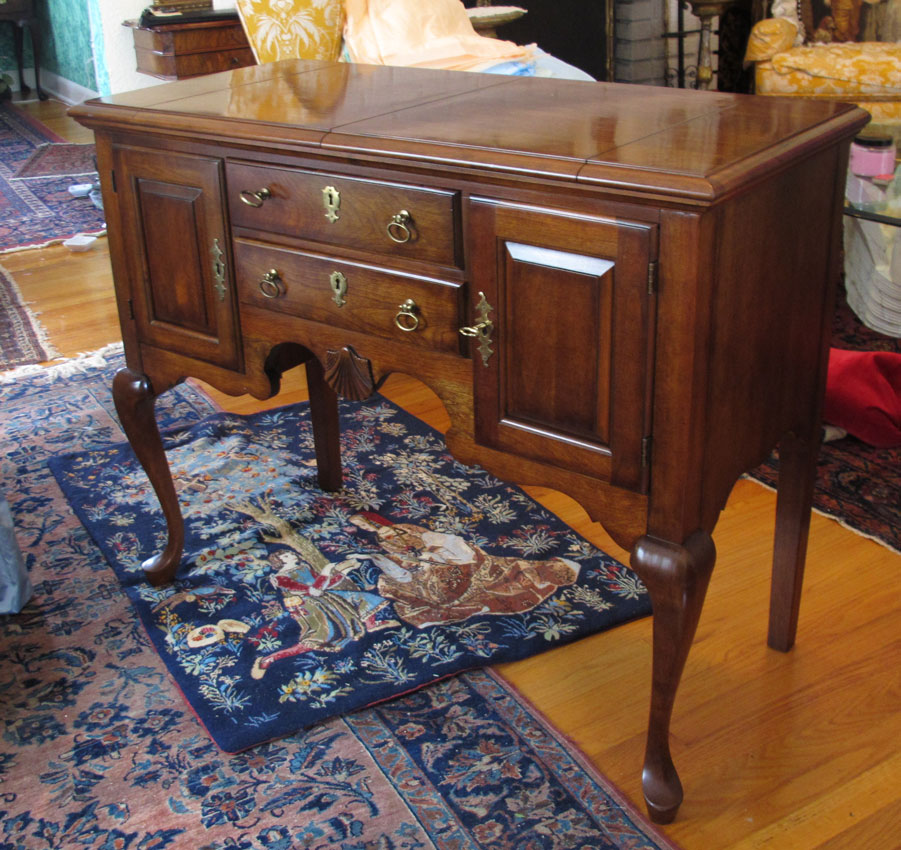 PENNSYLVANIA HOUSE MAHOGANY BUFFET: Queen Ann style, hinged top opens to leather surface. 2 central silverware drawers surmounted by 2 doors. Queen Anne front legs. 32 1/4'' x 40'' x 18''.