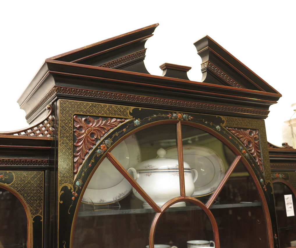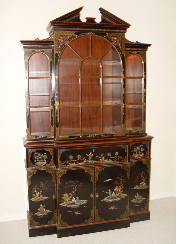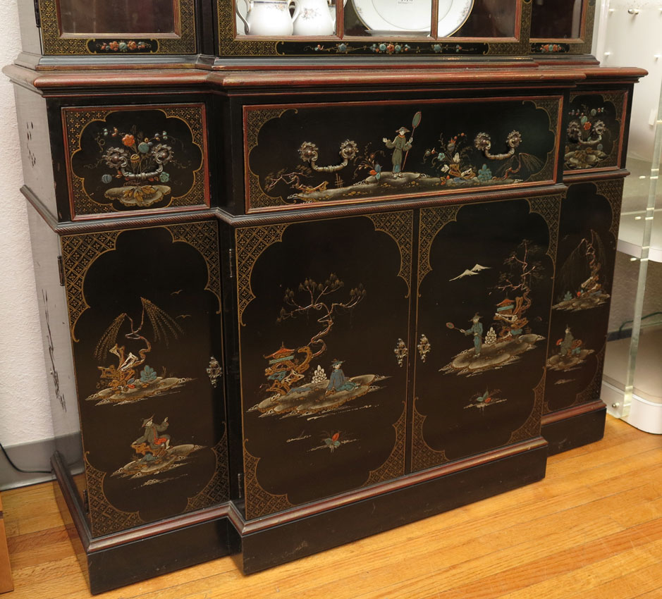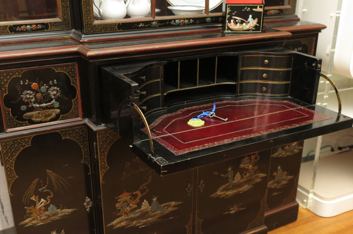 CHINOISERIE DECORATED SECRETARY BOOKCASE: Architectural crest over 3 glass doors, illuminated interior with 3 glass shelves in each section. Base with central drawer revealing desk with embossed leather writing surface, 6 shaped drawers, 5 pigeon holes and matching letter holder. Central drawer surmounted by 2 side drawers, all over 4 doors. 84 1/4'' h. x 49 3/4'' x 17 3/4''.
