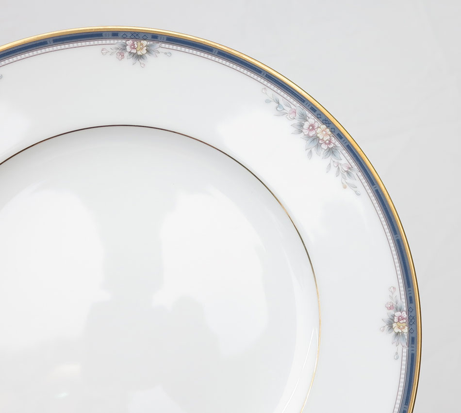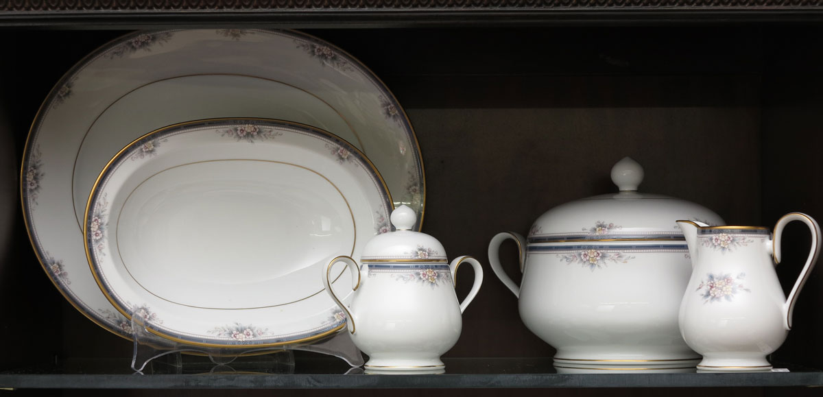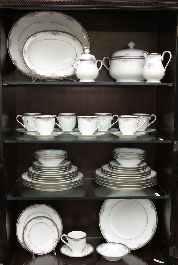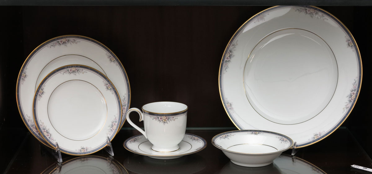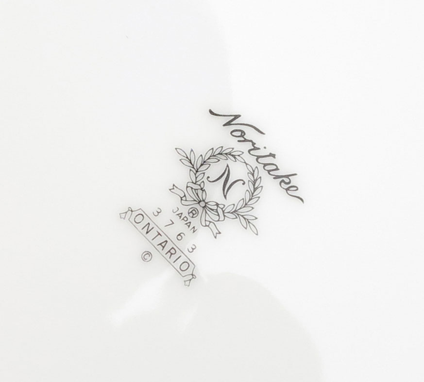 NORITAKE ''ONTARIO'' FINE CHINA FOR 8: Approx. 51 pieces to include 8 each of dinner plates (10.5''), salad plates, bread plates, tea cups, saucers, and dessert bowls. Also the 10.5'' deep covered vegetable, creamer and covered sugar.