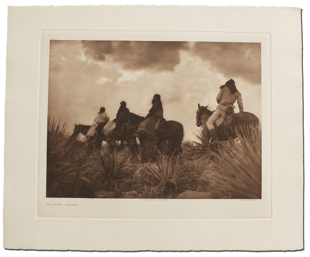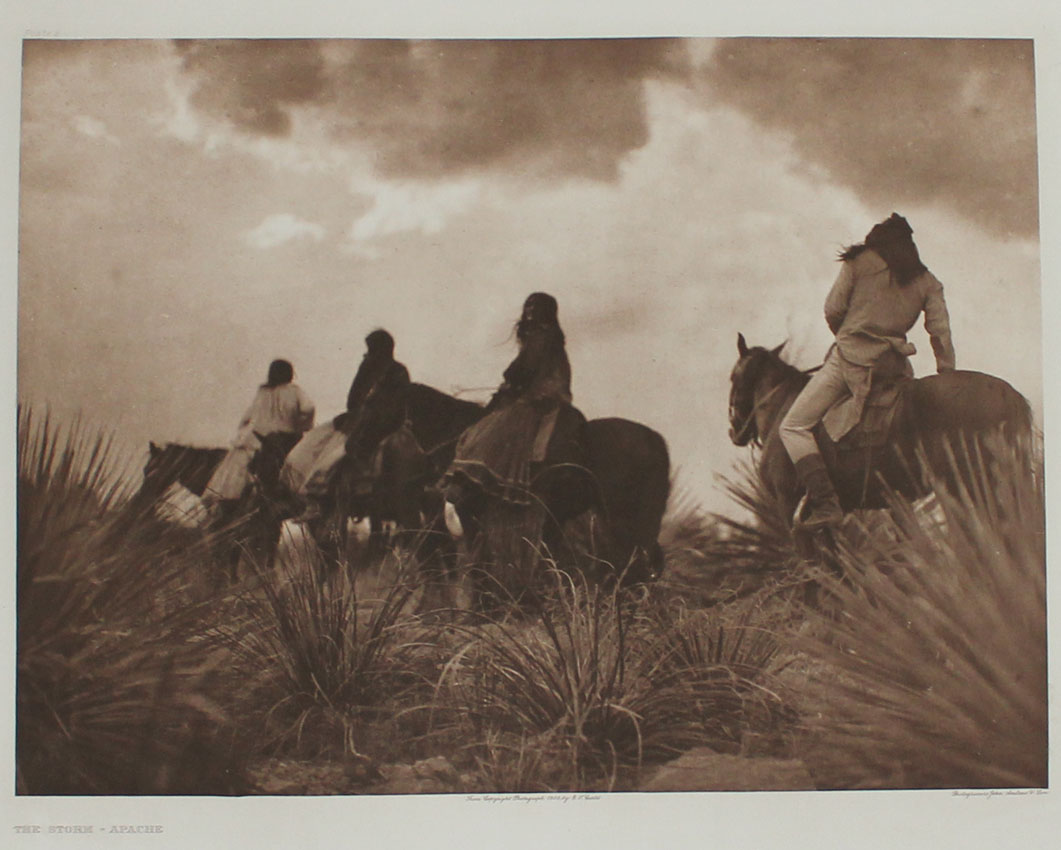CURTIS, Edward, (American, 1868-1952): ''The Storm-Apache'', Photogravure, 18'' x 22'' with margins, titled lower left, plate 9 upper left, from copyright photograph 1906 by E. Curtis, photogravure by John Andrew & Sons. Finely printed from the original plate in 1982 by master printmaker, author and teacher Deli Sacilotto, edition size less than 15.