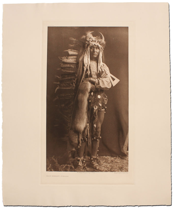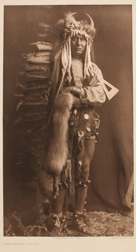 CURTIS, Edward, (American, 1868-1952): ''Iron Breast-Piegan'', Photogravure, 22 3/4'' x 17 3/4'', titled lower left, plate 206 upper left, from copyright photograph 1900 by E. Curtis, photogravure by John Andrew & Sons. Finely printed from the original plate in 1982 by master printmaker, author and teacher Deli Sacilotto, edition size less than 15.