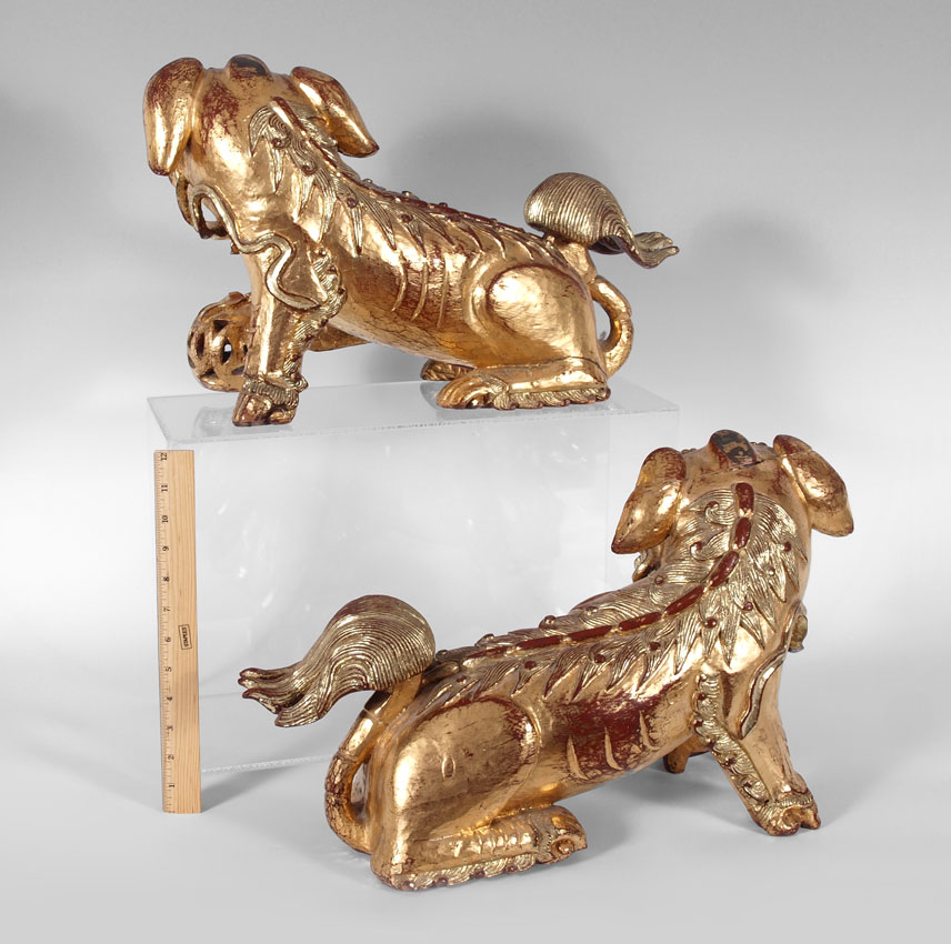 CONDITION: Note male dog has repairs to 2 feet and front leg. Female has age crack to head, missing 2 sections of tail. Loss of gilt to both.