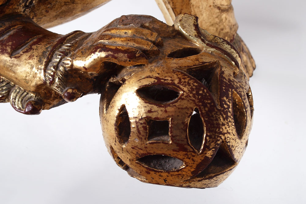 PAIR CARVED WOOD GOLD GILT TEMPLE DOGS: Red lacquer and gold gilt pair. Larger of pair measures 12 1/4'' h. x 19'' x 7 1/2''. Age unknown.