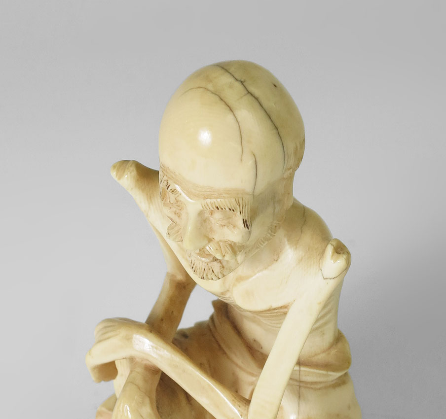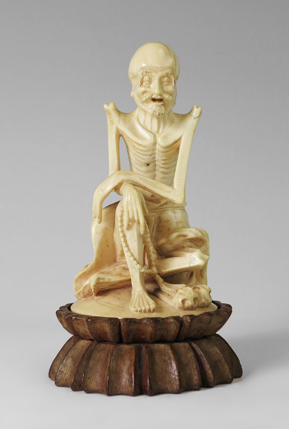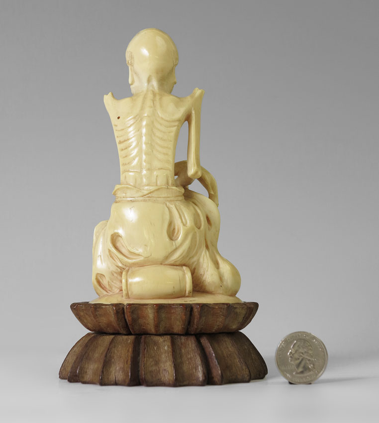 CHINESE CARVED IVORY SKELETAL LOHAN FIGURE: Seated skeletal Lohan or Arhat figure holding beads, incised signature on base. Measures 5 5/8'' h. x 3''. Sold with carved wood base, 1 1/2'' h. x 3 5/8''.