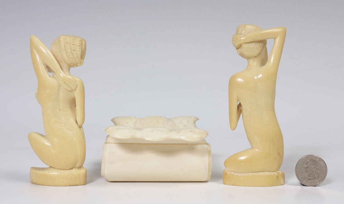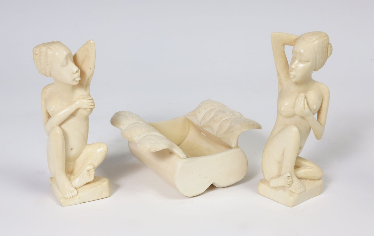 3 PIECE AFRICAN CARVED IVORY: To include 2 seated nude female figure, 4 1/2'' h. and a vessel with carved figural fish handles, 1 3/4'' h. x 3 1/4'' x 4''.