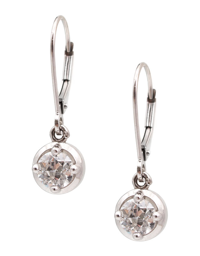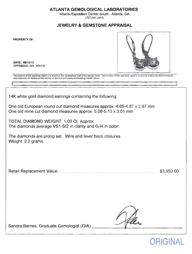 14K DIAMOND DROP EARRINGS: One old mine cut and one old European cut diamond total approx. 1.00 Ct, rated VS1-SI2 in clarity and G-H in color. Prong set in 14K white gold. Wire and lever back closure. Weight 2.2 grams. Sold with current Atlanta Gemological's GIA graduates appraisal for $3,950.