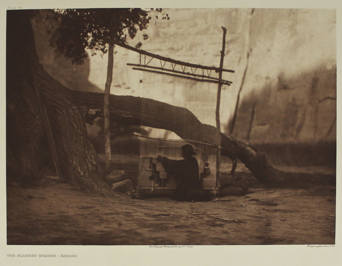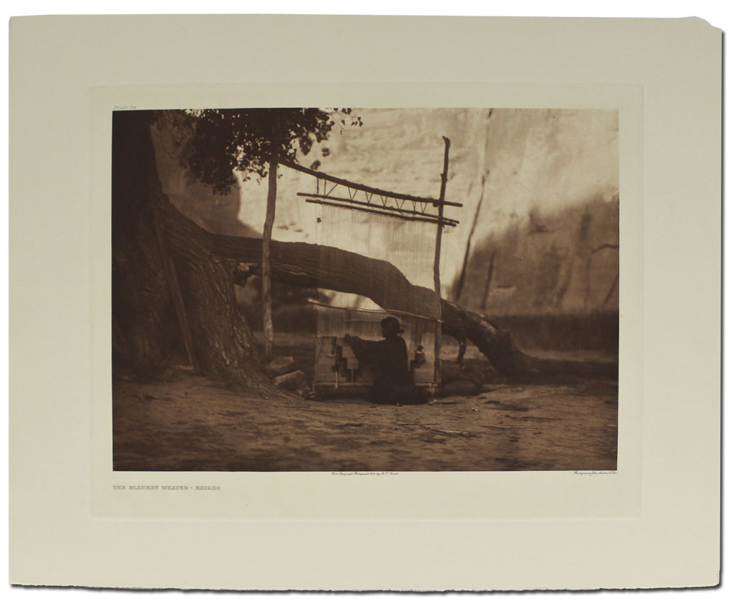 CURTIS, Edward, (American, 1868-1952): ''The Blanket Weaver-Navajo'', Photogravure, 18'' x 22'', titled lower left, #'d plate 34 upper left, from copyright photograph 1904 by E. Curtis, photogravure by John Andrew & Sons, unframed on Arches Paper. Finely printed from the original plate in 1982 by master printmaker, author and teacher Deli Sacilotto, edition size less than 15.