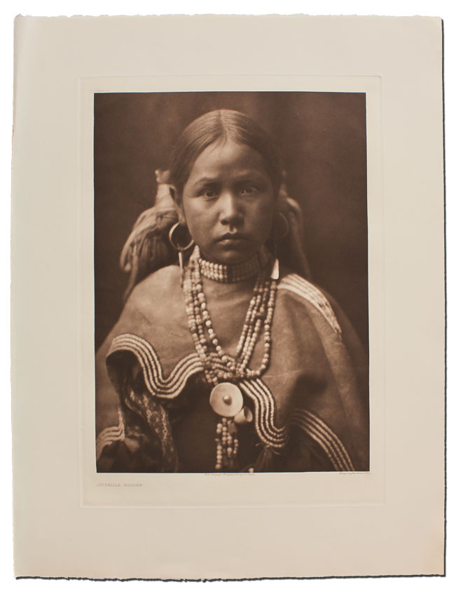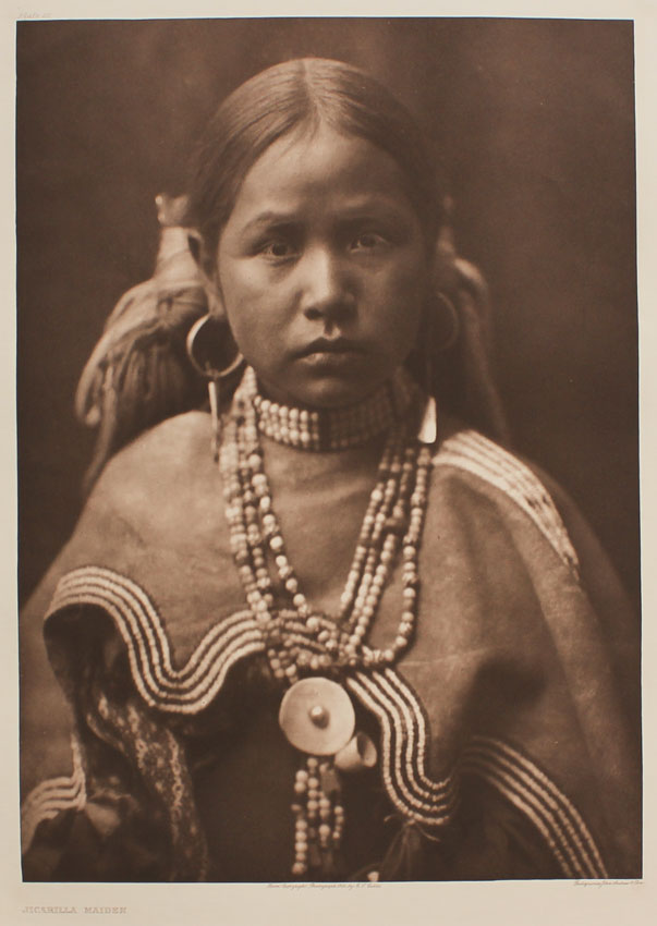 CURTIS, Edward, (American, 1868-1952): ''Jicarilla Maiden'', Photogravure, 23 1/4'' x 18 3/4'' with margins, titled lower left, #'d plate 22 upper left, from copyright photograph 1904 by E. Curtis, photogravure by John Andrew & Sons, unframed. Finely printed from the original plate in 1982 by master printmaker, author and teacher Deli Sacilotto, edition size less than 15.