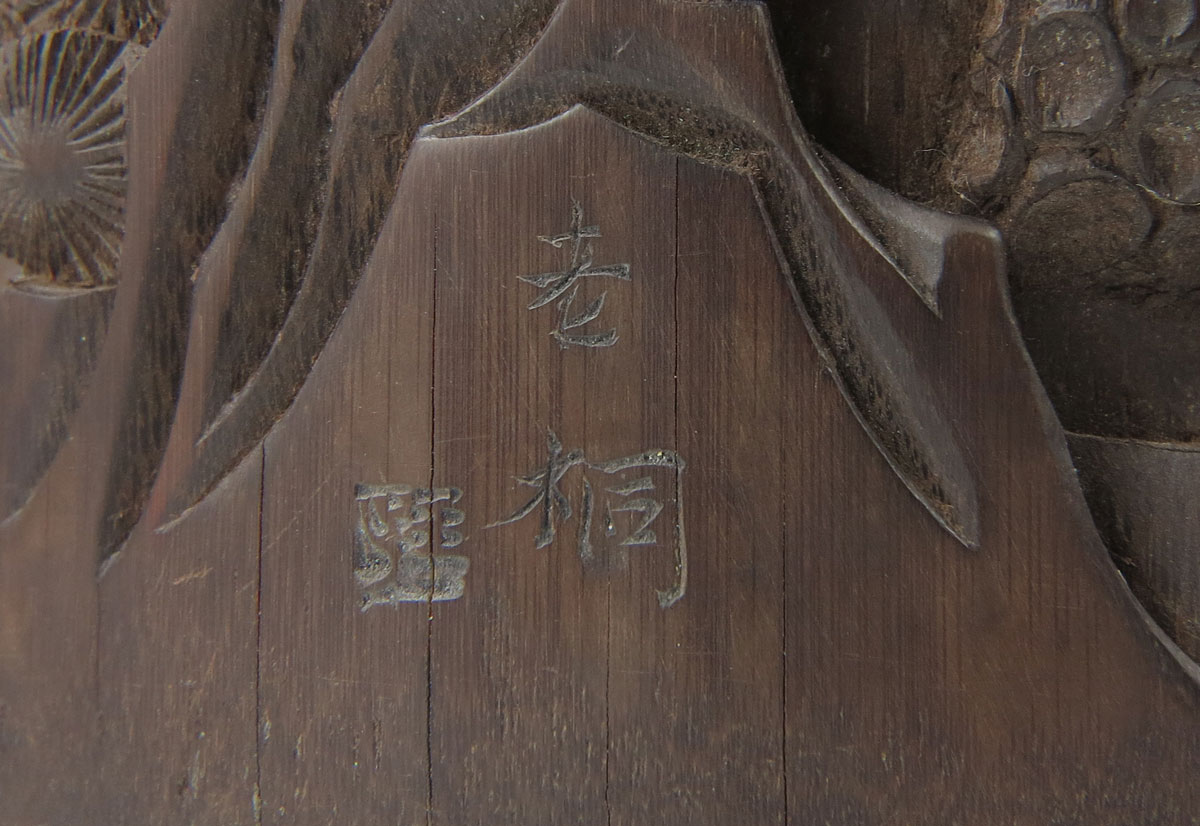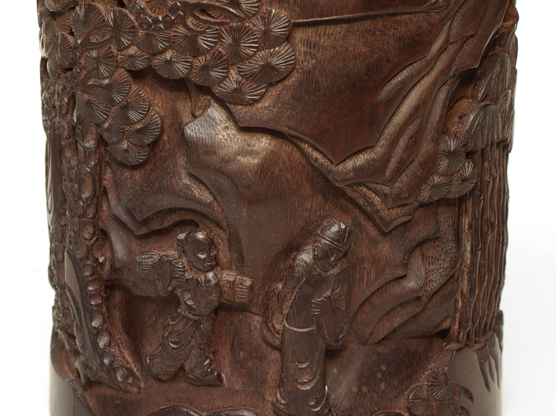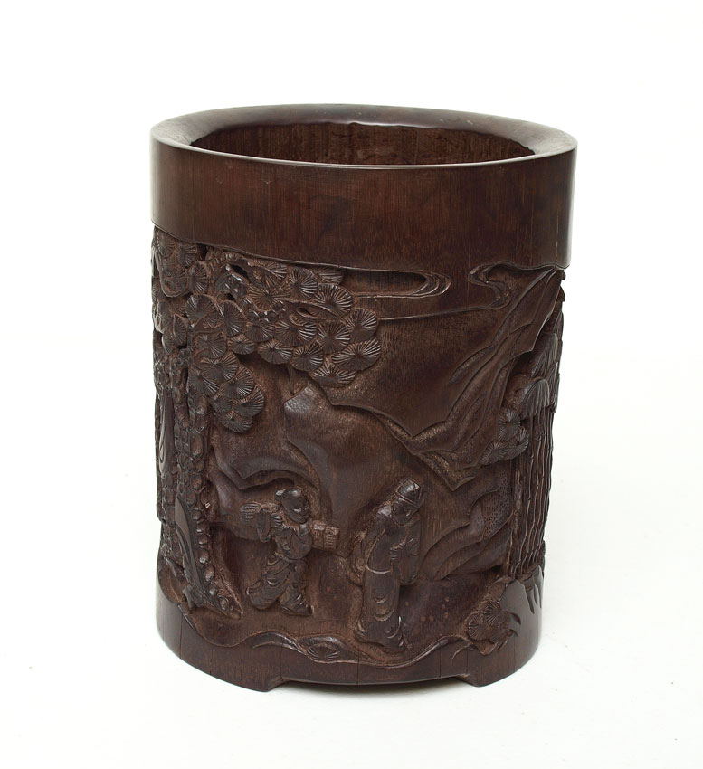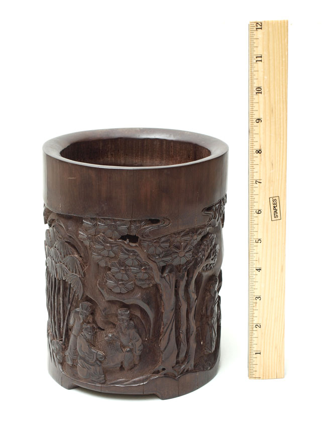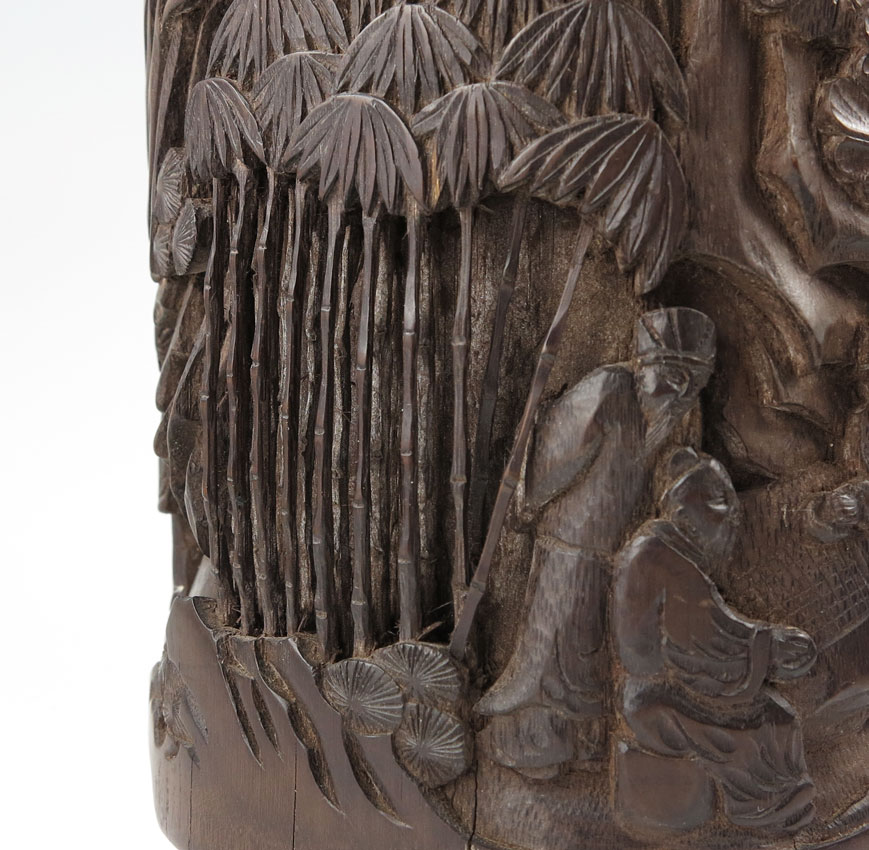 CHINESE CARVED BAMBOO BRUSH POT: Highly detailed showing the sages of the bamboo grove. Artist signed, approx. 8'' tall x 6'' dia. Actual age unknown.