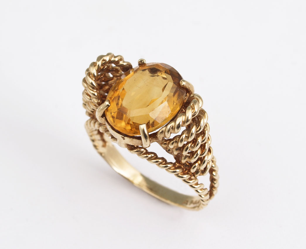 3 CT. CITRINE RING: One single 3 Ct oval mixed cut citrine nestled in a 14K yellow gold ring. . Abraded crown. The citrine is prong set. Weight: 5.6 grams. Size: 7