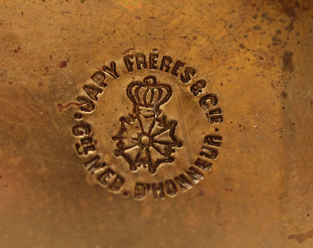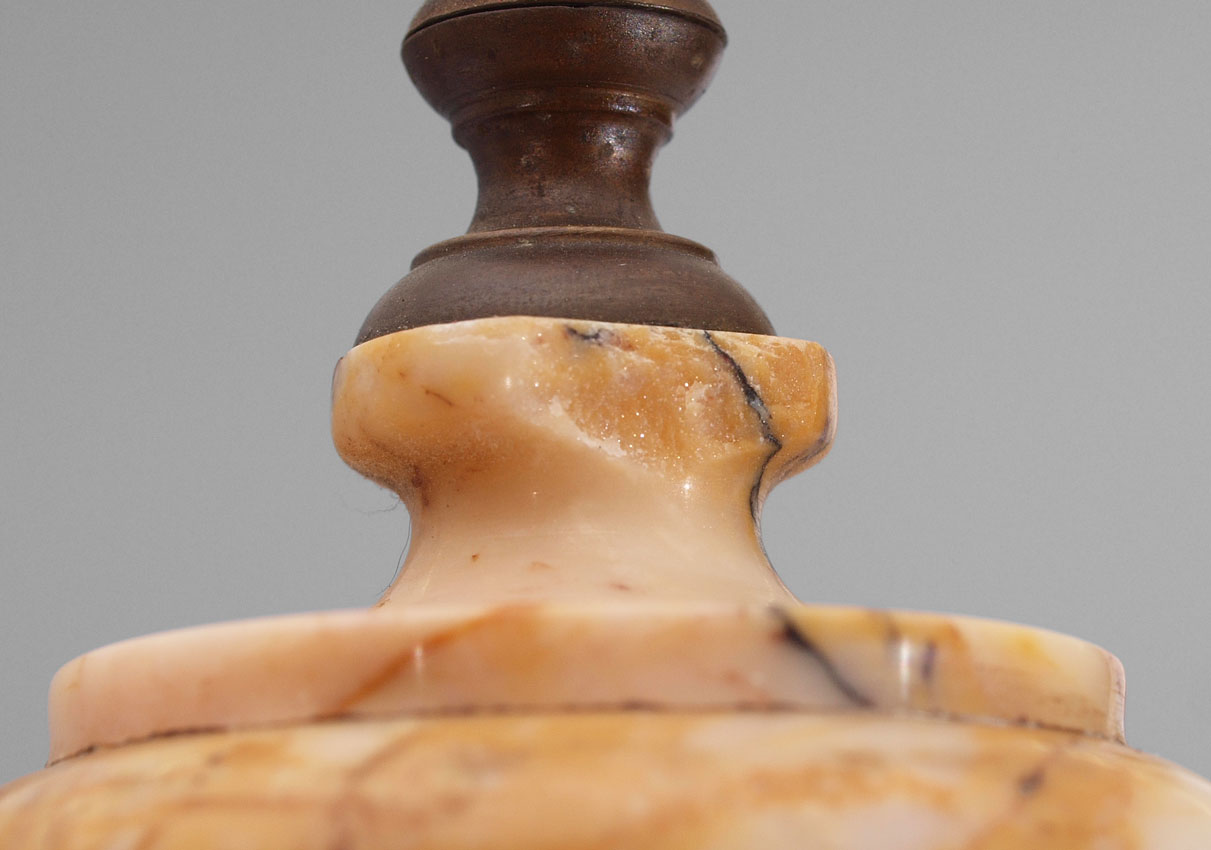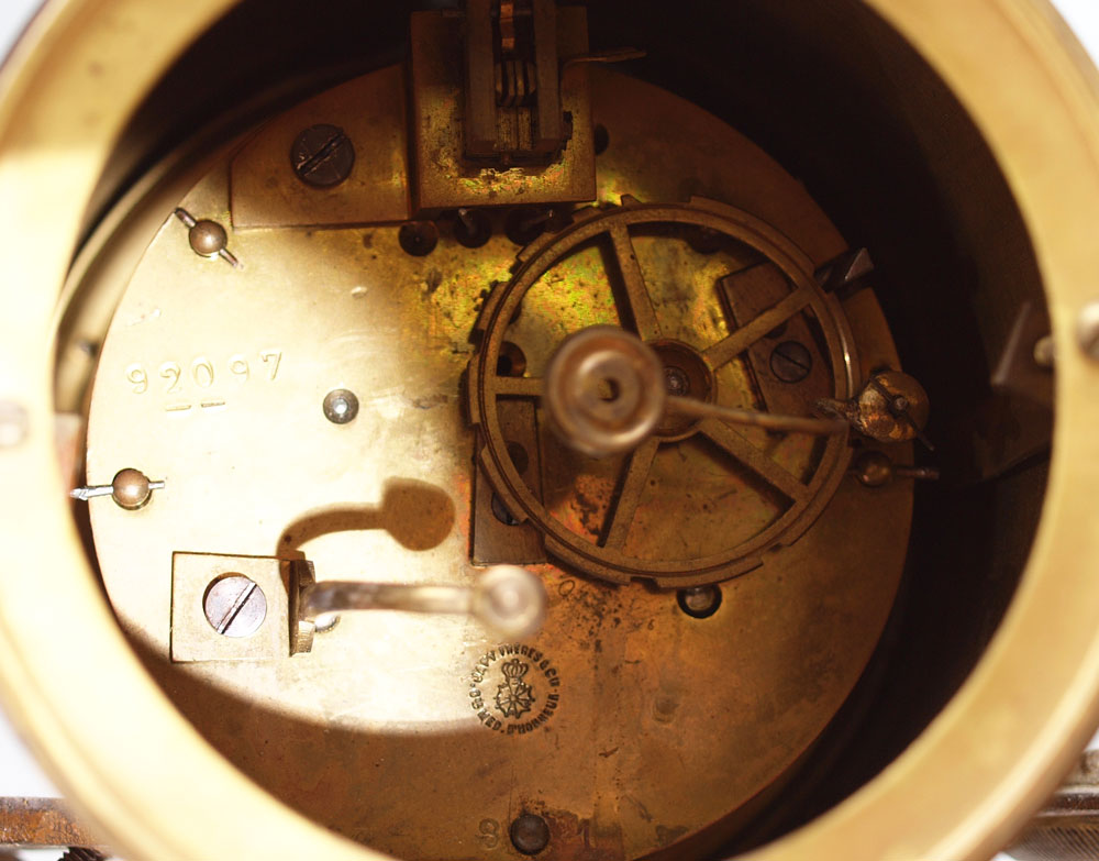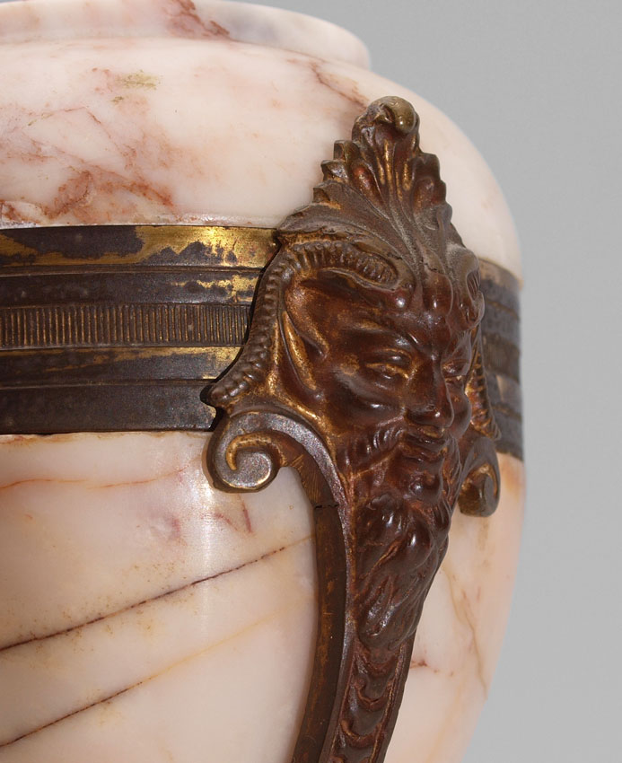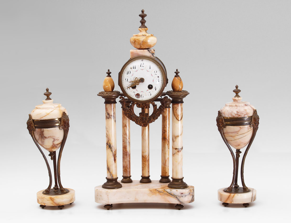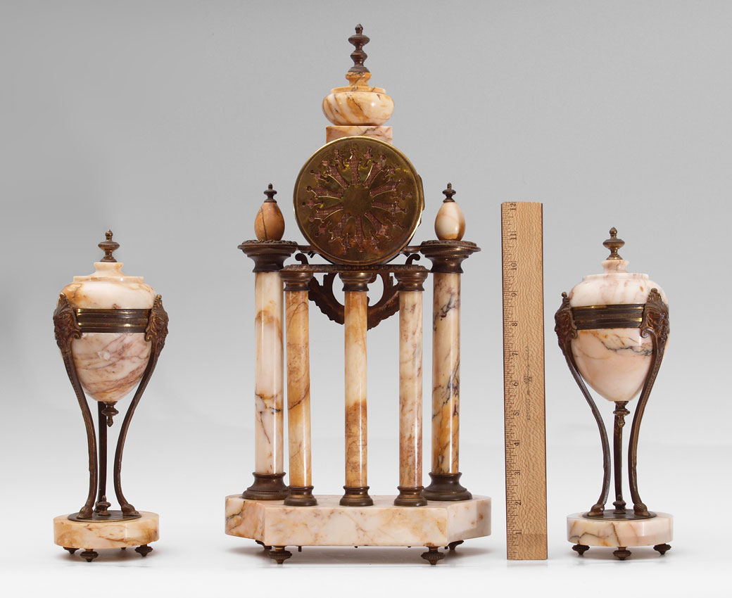 FRENCH MARBLE PORTICO CLOCK GARNITURE SET: Urn finial over 5 columns with shaped base on 4 feet. Brass case with applied embossed decoration. Hand painted porcelain dial, replacement hands. Japy Freres time and strike movement. Measures 18 1/4'' h. x 9 1/4'' x 4''. Sold with marble urn garniture set, cast brass supports with north wind masqueron embellishments, ending in hoof feet on round marble base. 9 1/4'' h. x 3 5/8'' dia.