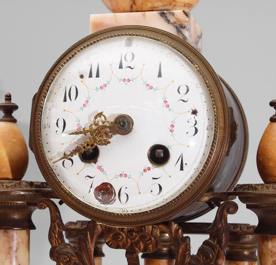 CONDITION: Note chips to porcelain on dial, repair to one column. Chips to marble on garniture, bend to other, please call for condition, movement will require repair.