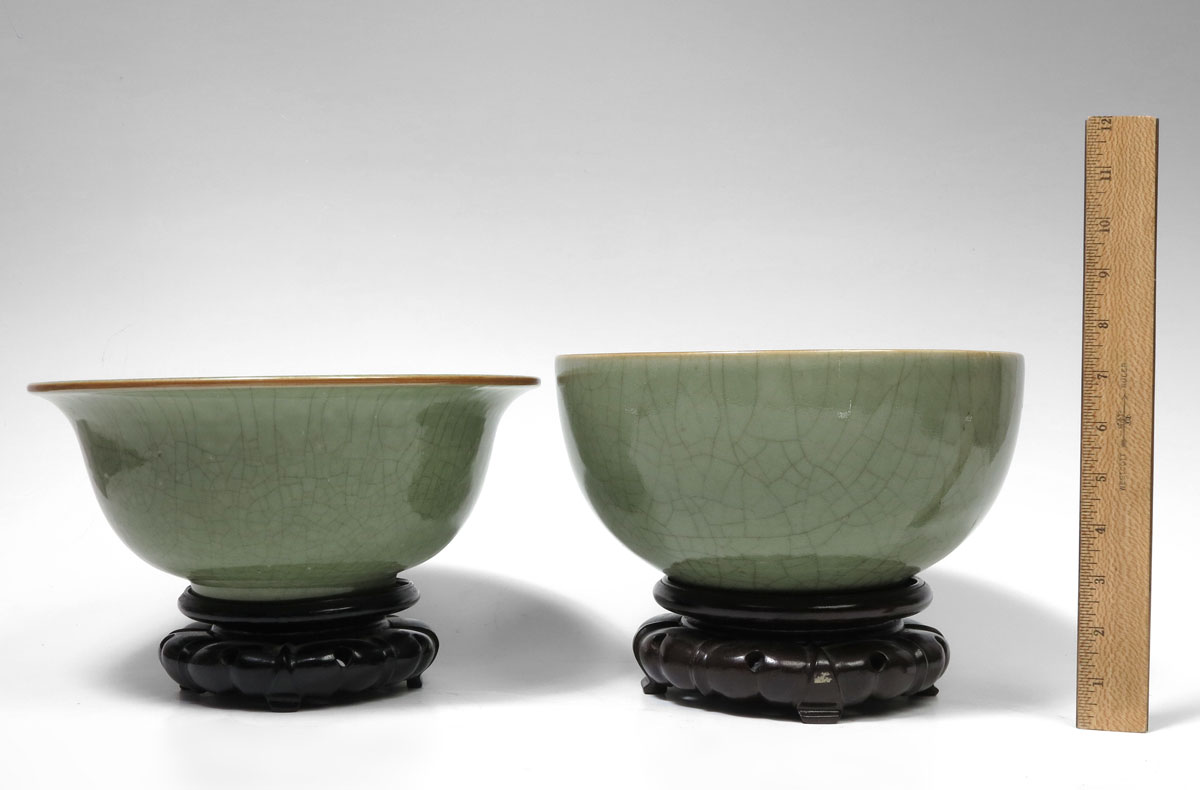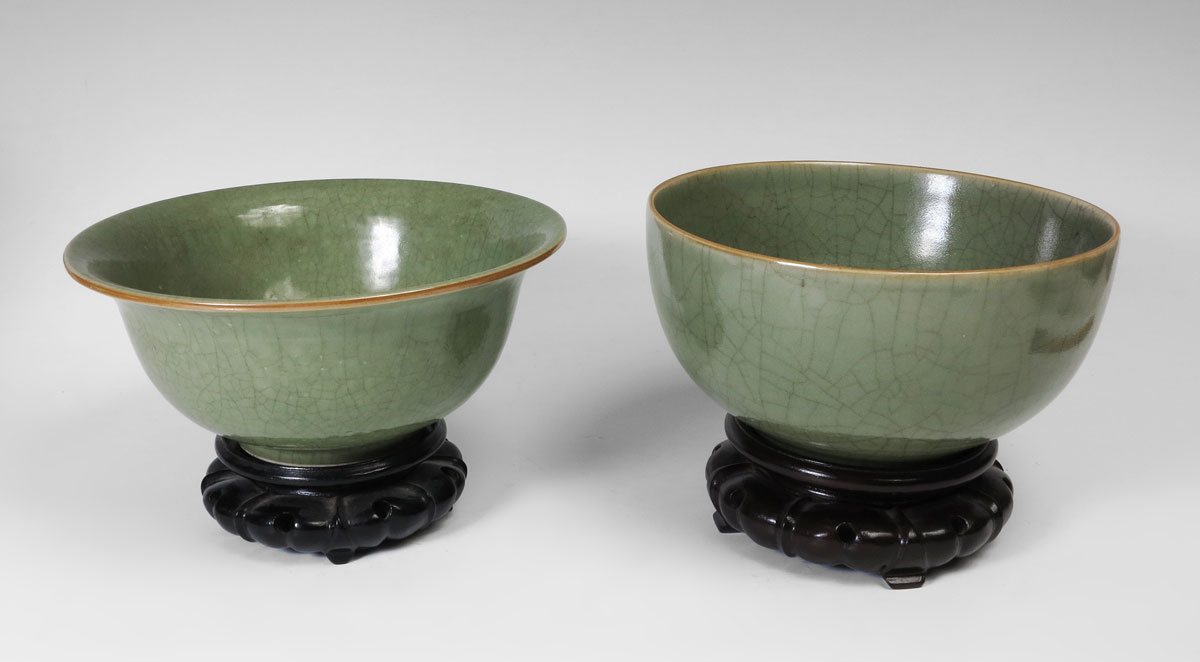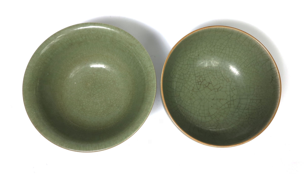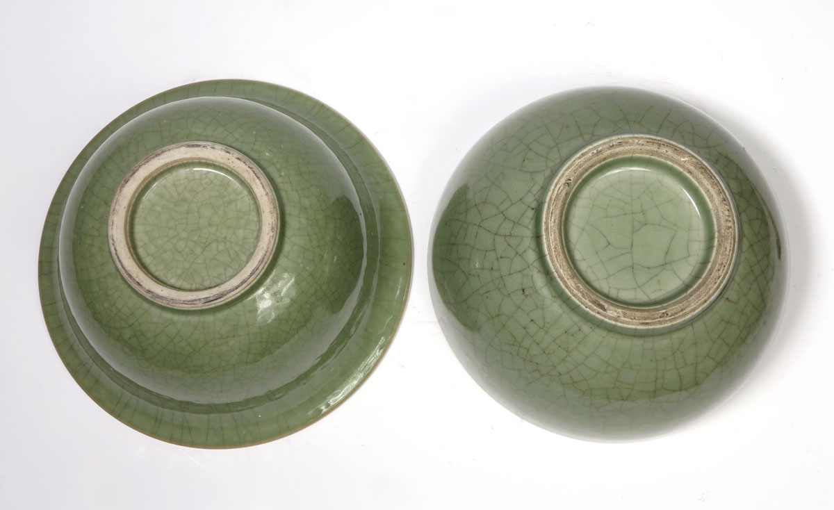 2 PIECE CHINESE CRACKLE CELADON BOWLS: 1) Flared rim, 10'' dia., 5'' tall. 2) Straight sides, 10 3/4'' dia., 4 1/2'' tall. Actual age unknown. From the Estate of John Desmond and his wife Janina Hardoon Desmond.