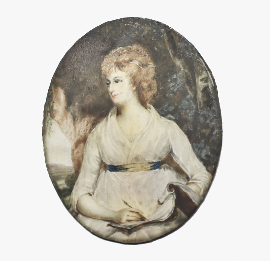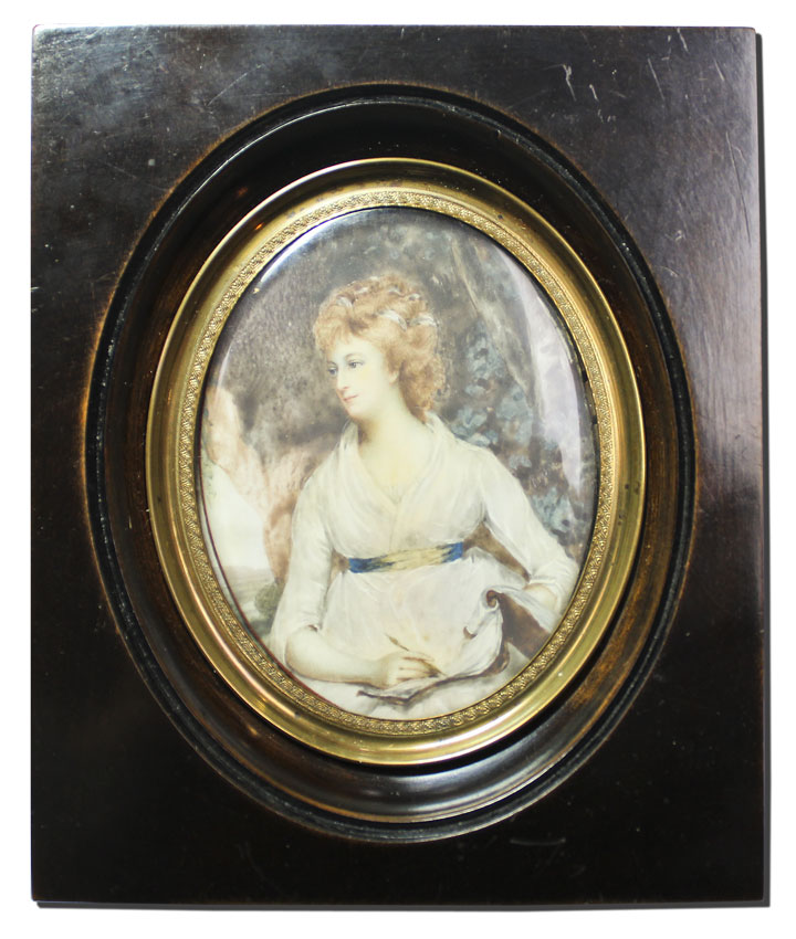EXCEPTIONAL MINIATURE PORTRAIT PAINTING ON IVORY ILLEGIBLY SIGNED: Oval, 3 1/2'' x 2 5/8'', signed in the left margin, Roijsva?, scene depicts a young beauty penning in her notebook, encased in a shaped wooden frame with gilt metal insert, 5 5/8'' x 4 3/4''.