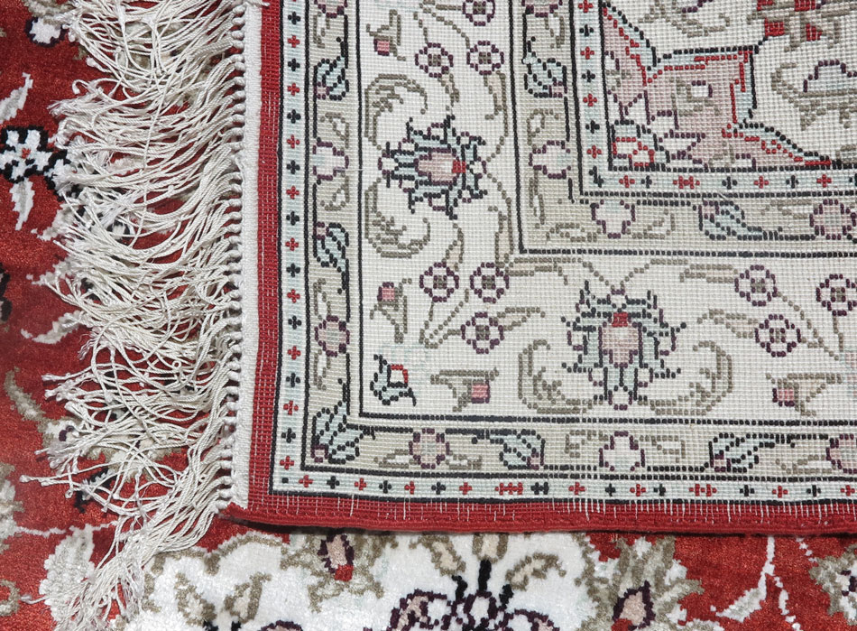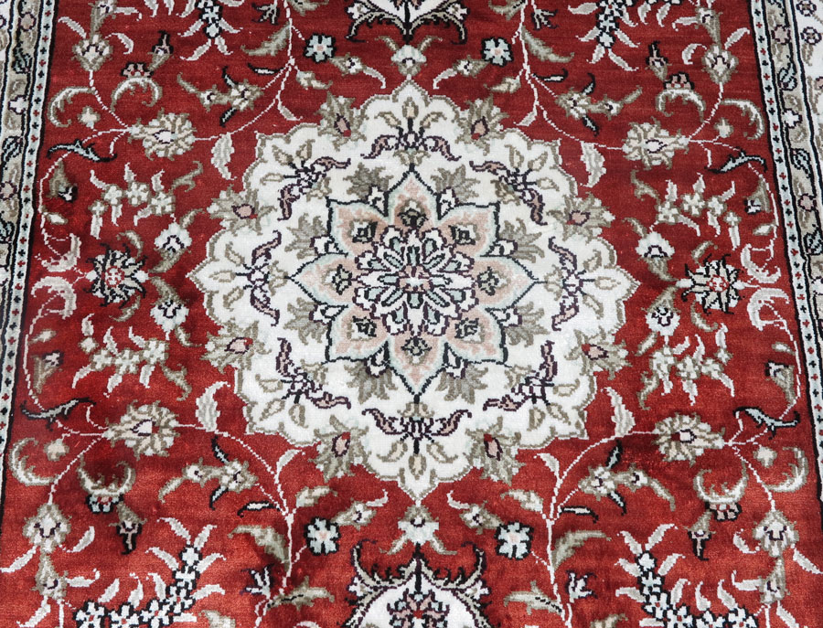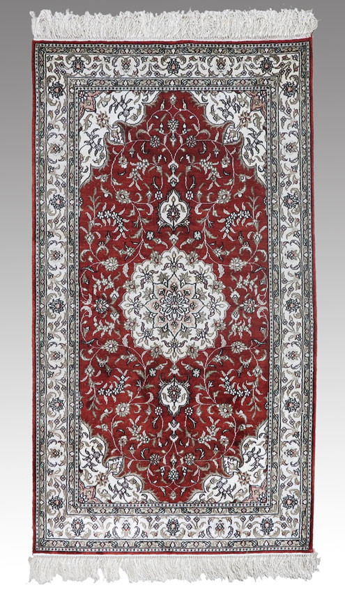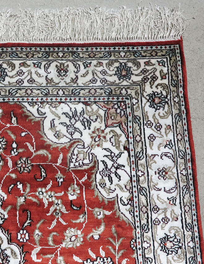 MODERN INDO-PERSIAN HAND KNOTTED WOOL RUG, 3'1'' x 5'1'': This rug has a traditional Persian design, its red rust field surrounding a mostly white central medallion. The corners of the field and the borders are also white with pale grey and black vines and flowers like those in the center. The strong contrast in color grounds make for a bold and interesting rug. Condition is good.