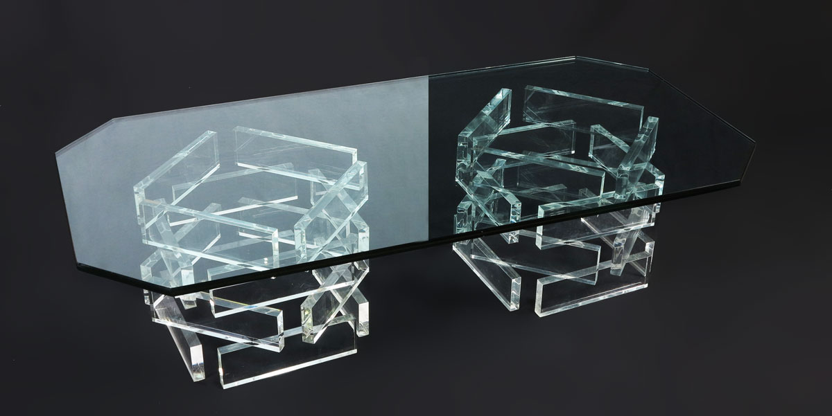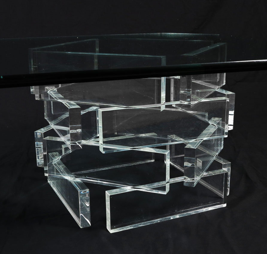 VAN TEAL STYLE LUCITE BASE TABLE: Double Lucite pedestal base with thick glass top. Each base 14 1/2'' h. x 19'' square, top 59 3/4'' x 30''.