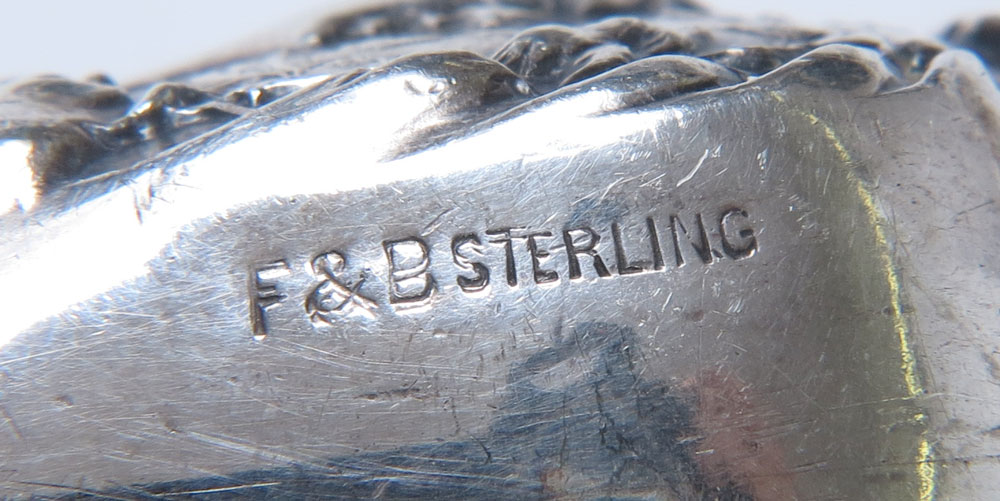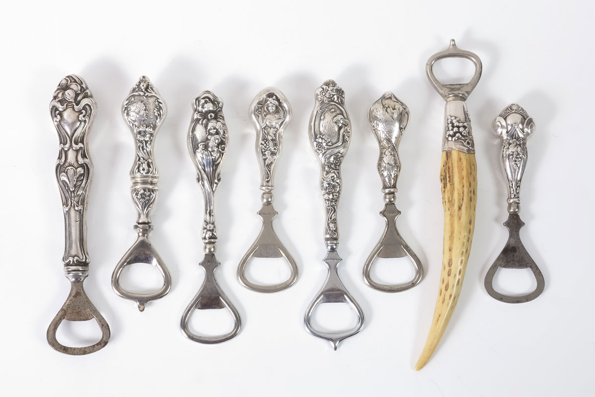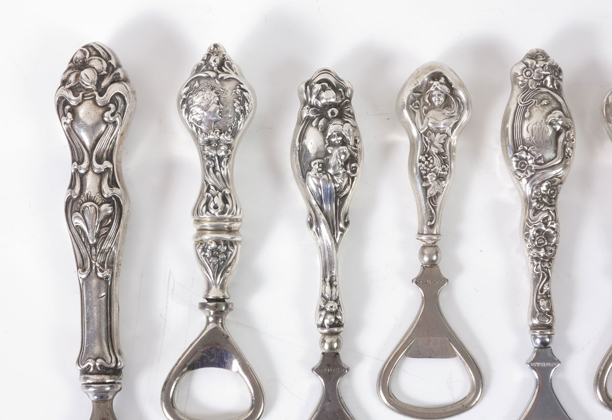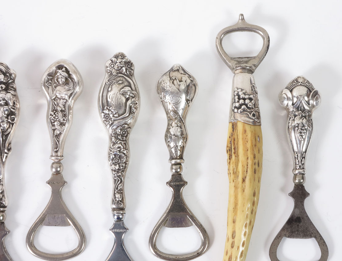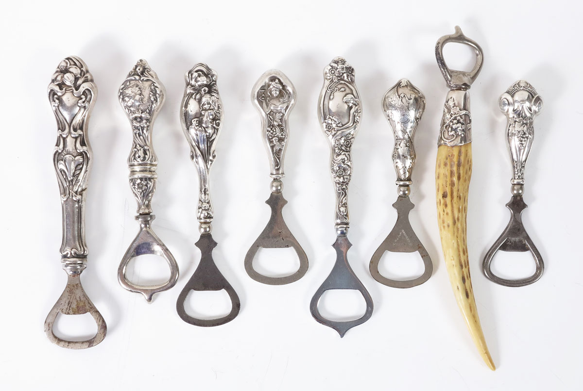 ART NOUVEAU STERLING HANDLE BOTTLE OPENERS: An assembled collection to include 1) Woman with glass and grapes. 2) Grape motif. 3) Woman with raised arm and flowing dress, floral. 4) Foster & Bailey woman with birds. 5) Figural man with cards and glasses. 6) Unger Brothers Reine des Fleurs pattern. 7) Floral motif. 8) Bone handle with grape motif collar, 8'' l.