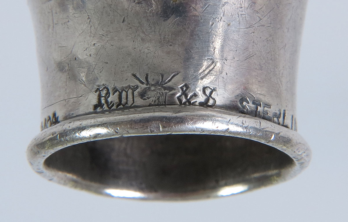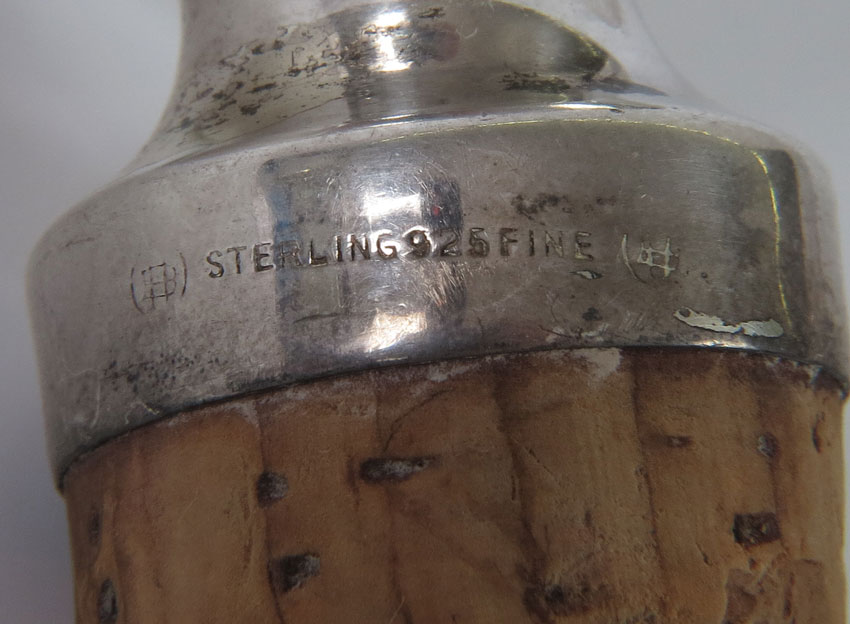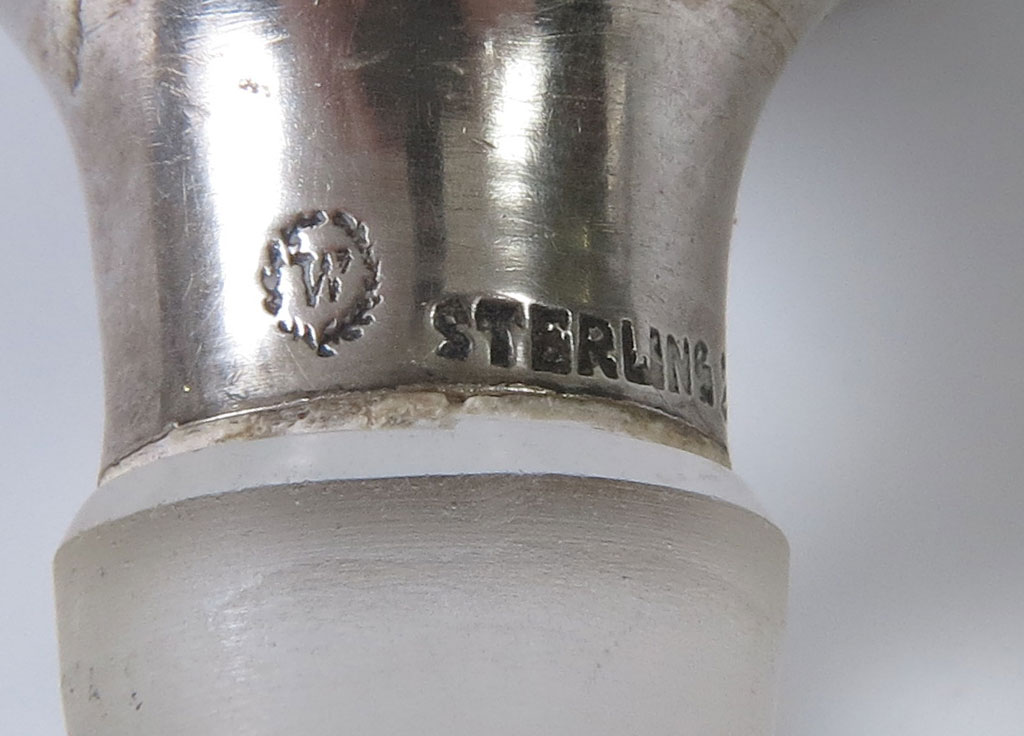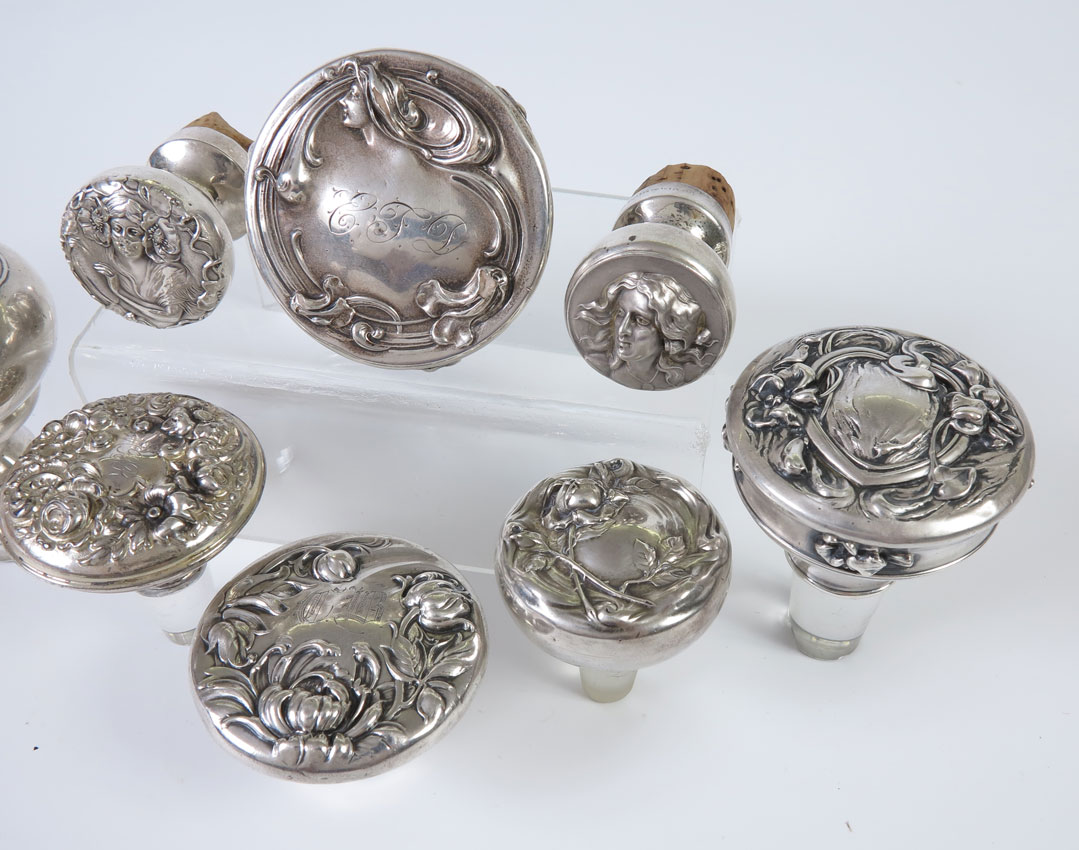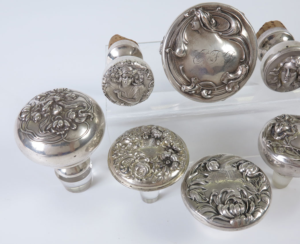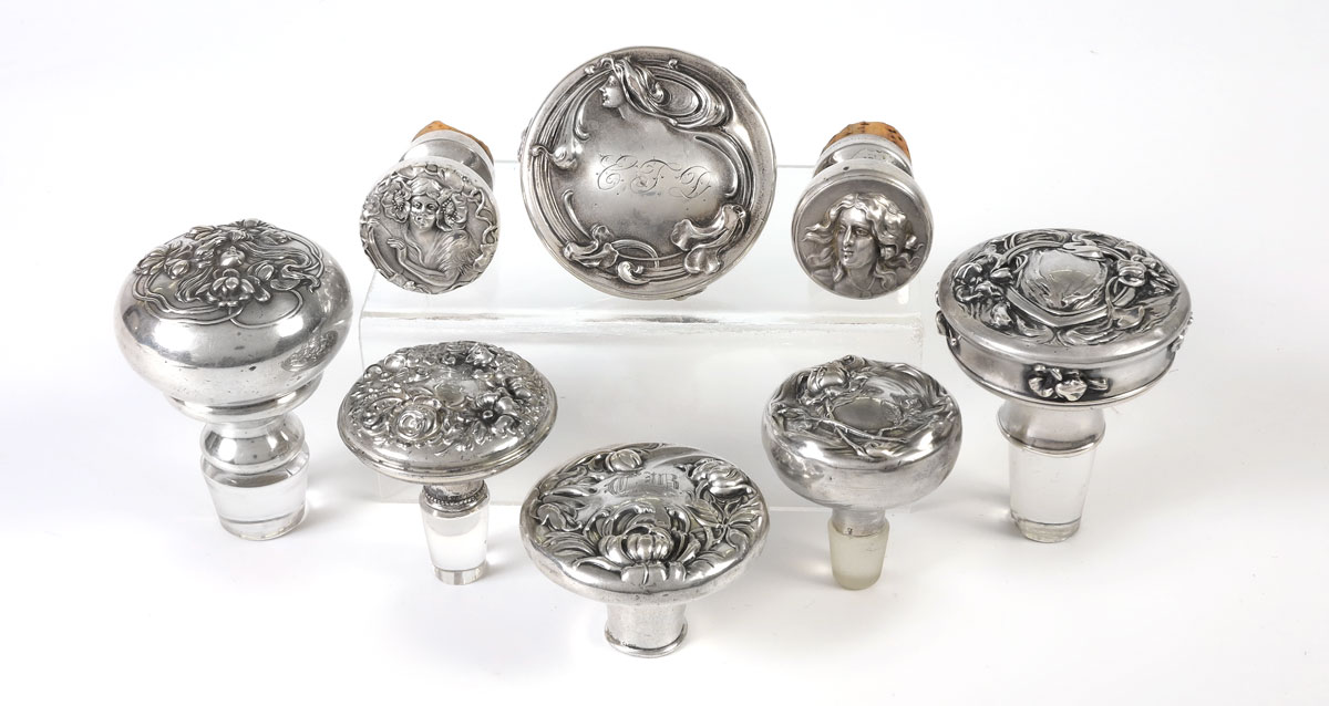 8 PIECE ART NOUVEAU STERLING BOTTLE STOPPERS: To include 1) Woodside Sterling rose motif, crystal stopper. 2) Floral motif, crystal stopper, monogrammed. Note fleabites. 3) Wallace floral motif, no stopper, monogrammed. 4) La Pierre floral motif, monogrammed, no stopper. 5) La Pierre water lily, crystal stopper. Note chips. 6) Kerr woman's head facing forward with flowers, crystal stopper. 3'' h. 7) Unger brothers woman facing right, cork stopper. 8) Unger Brothers woman facing forward with flowers, cork stopper.
