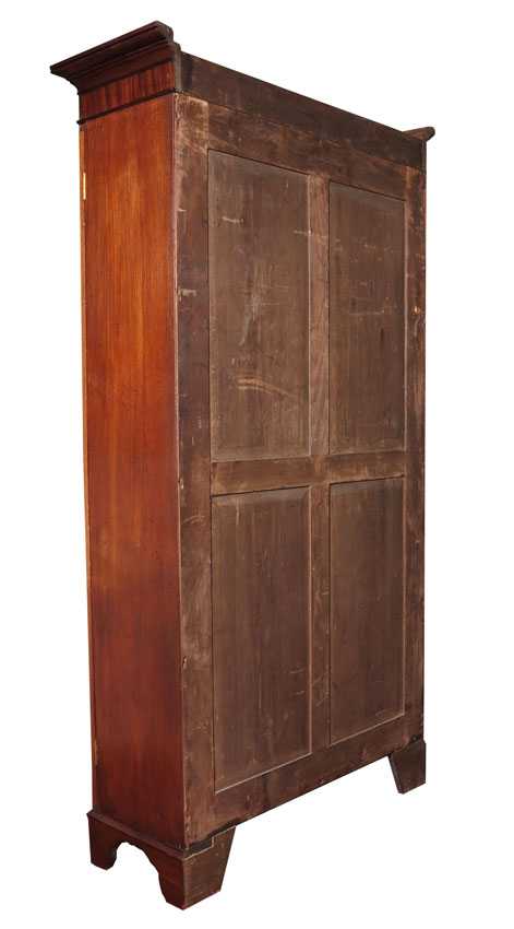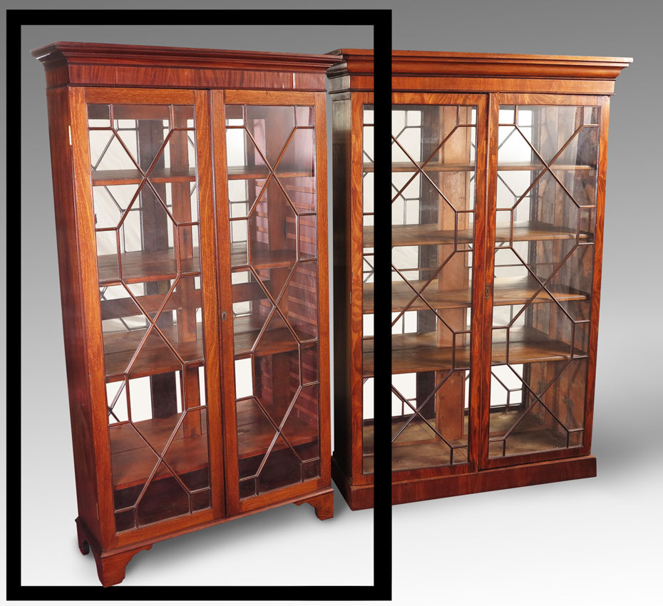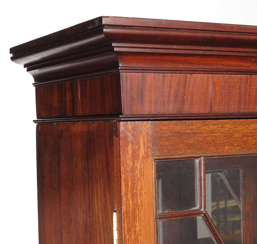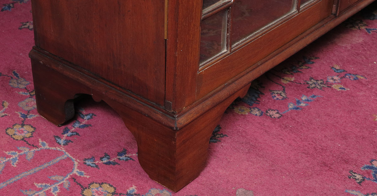 ENGLISH DOUBLE DOOR BOOKCASE DISPLAY CABINET: Stepped molding top over 2 segmented glass doors, paneled mirror back, 4 wood shelves. On shaped front legs. 77 1/2'' x 43'' x 15 1/4''.