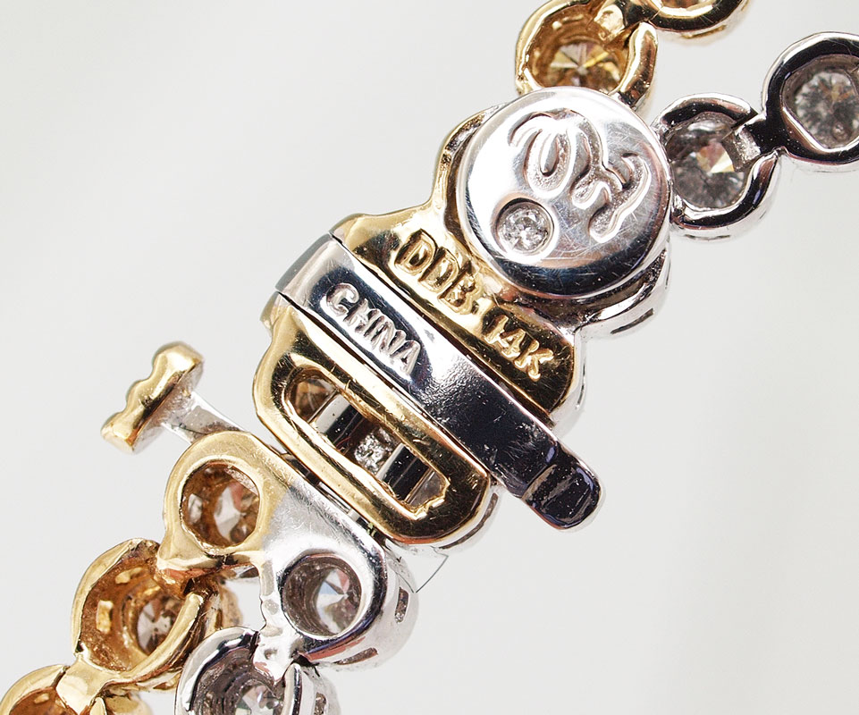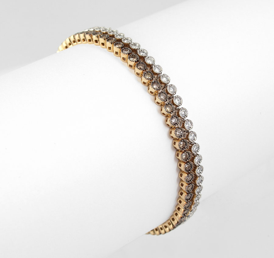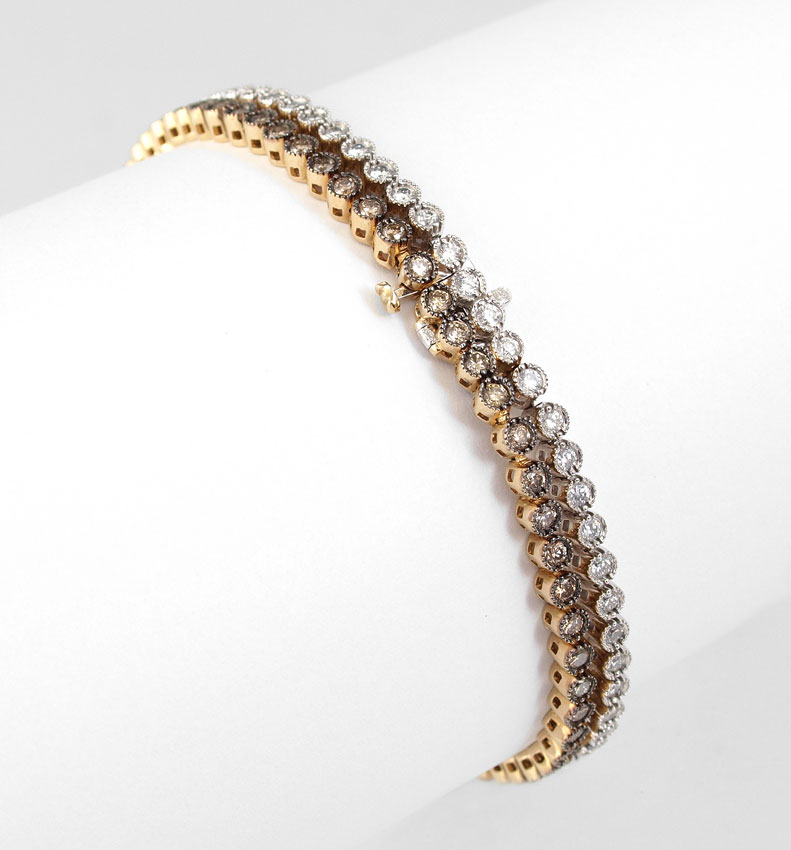 SIGNED DESIGNER TWO STRAND 14K DIAMOND BRACELET: 14K yellow and white gold diamond bracelet contains 122 round brilliant cut diamonds totaling approx. 3.00 Ct. The diamonds average VS-SI in clarity. 1.50 Ct. average G-H in color, the other half 1.50 Ct. Average Top Light Brown in color. The diamonds are prong set. Locking closure with hidden hinged safety clasp. Weight: 18.3 grams. Length: 7.5''