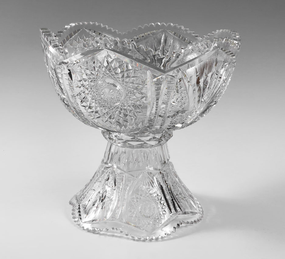 PERIOD AMERICAN BRILLIANT CUT GLASS PUNCH BOWL & STAND: Bowl 7 3/4'' h. x 14'' dia., base 7'' h. x 10 5/8'' dia.