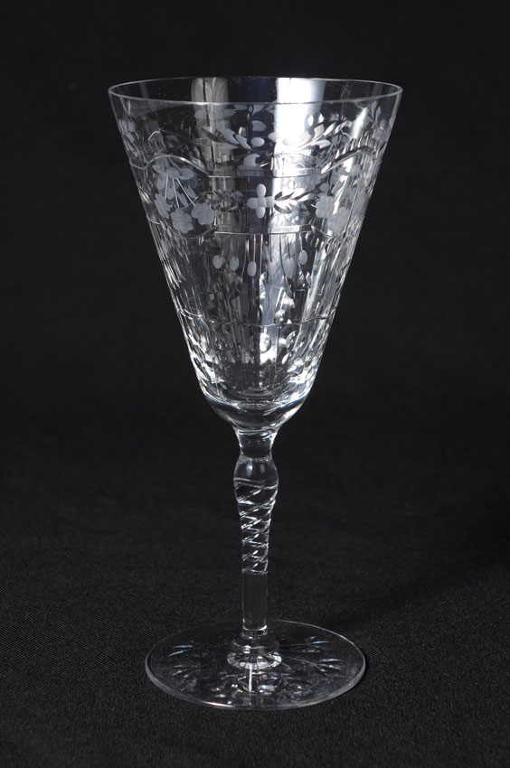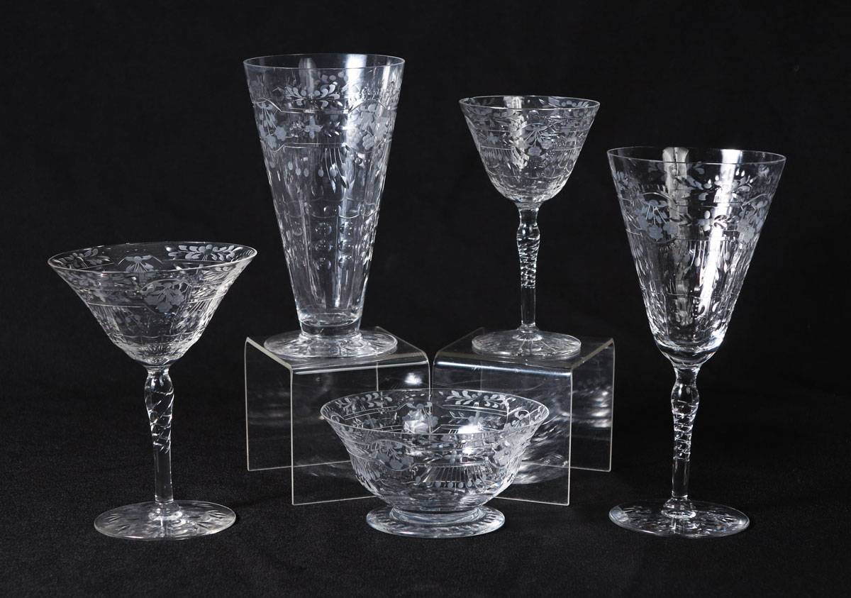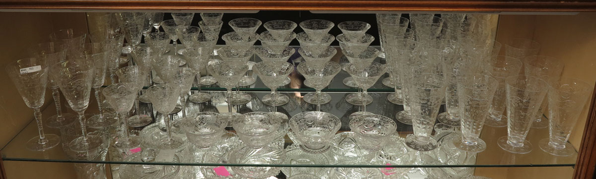 FINE CUT CRYSTAL SUITE: In the manner of Hawkes and Libbey Rock Sharp. 35 pieces to include 6 goblets (7.5''), 7 wine (5.25''), 8 tall sherbert champagnes (5.5''), 8 bowls (4'' dia. x 2.25'' tall) and 12 iced tea (6'').