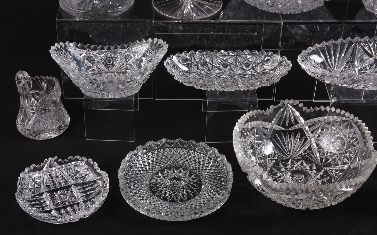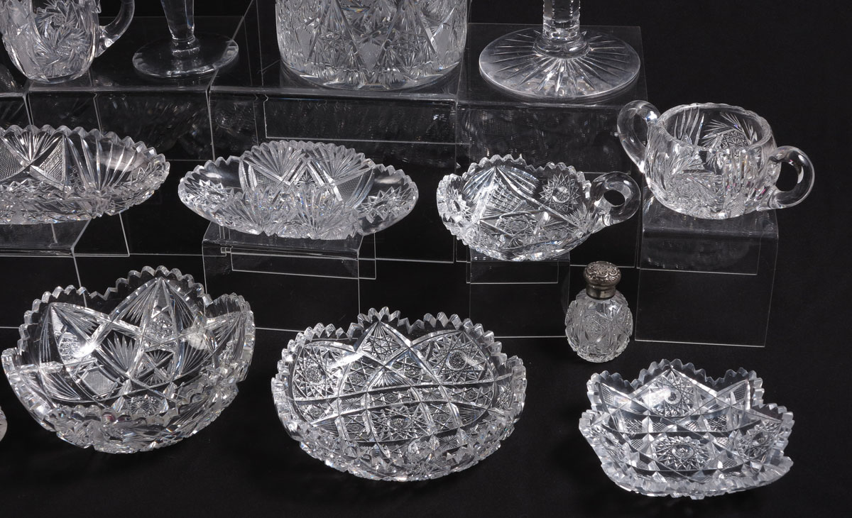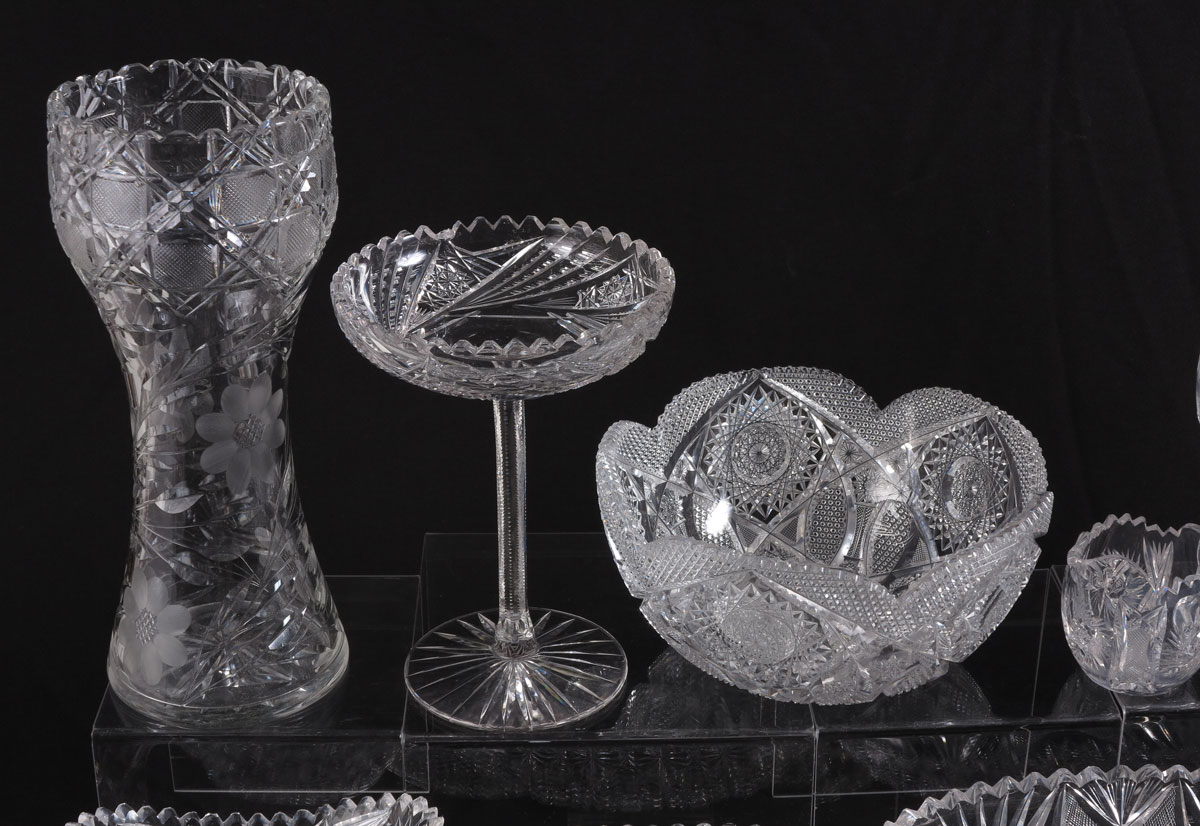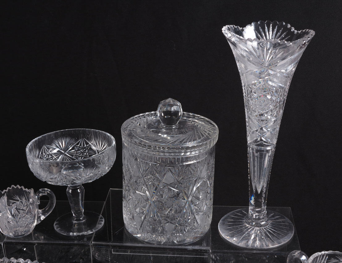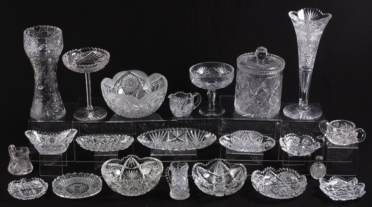 21 PIECE COLLECTION OF CUT GLASS ITEMS: An assembled collection to include 14'' trumpet vase, biscuit jar, ice cream dishes, bowls, sugar, creamers, an 8.75'' compote and more by assorted makers. Identified are pieces by Higgins & Seiter, Pitkin & Brooks and Pairpoint. The biscuit jar is a later example of cut glass.