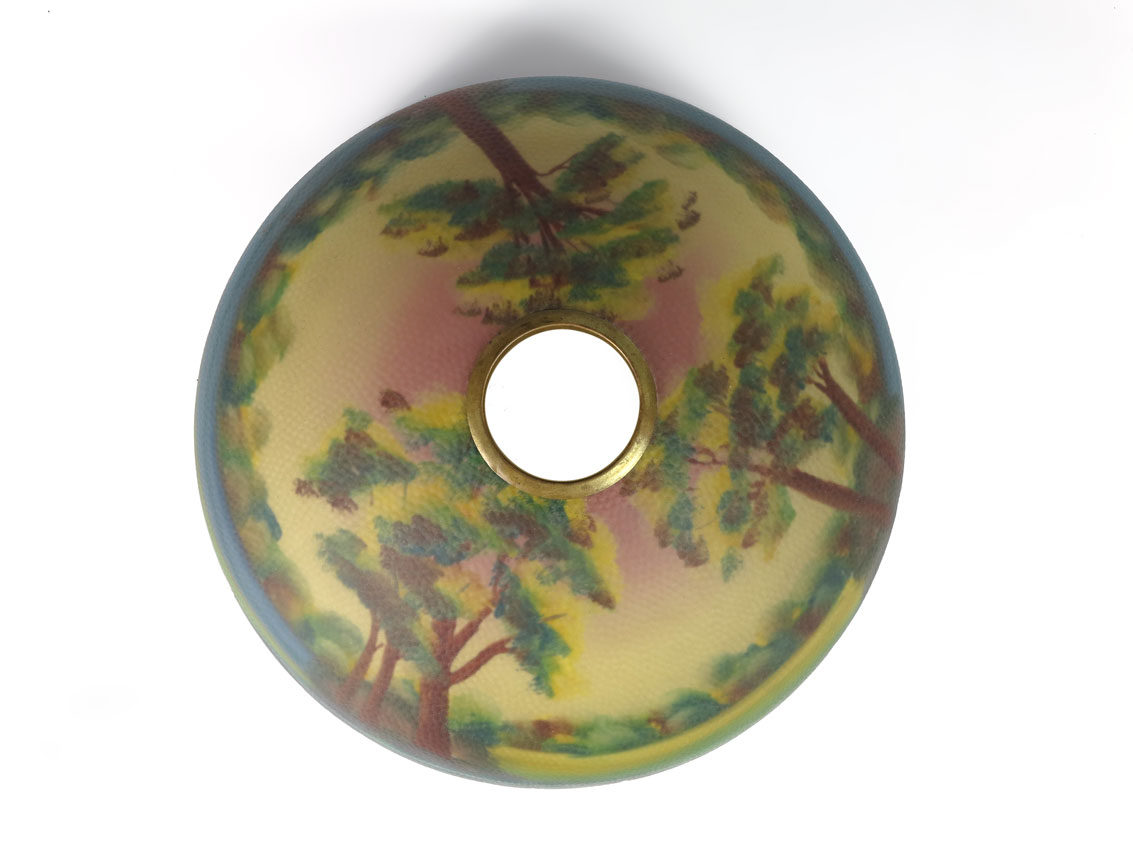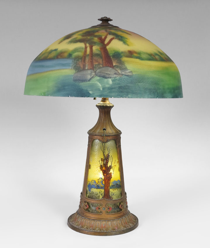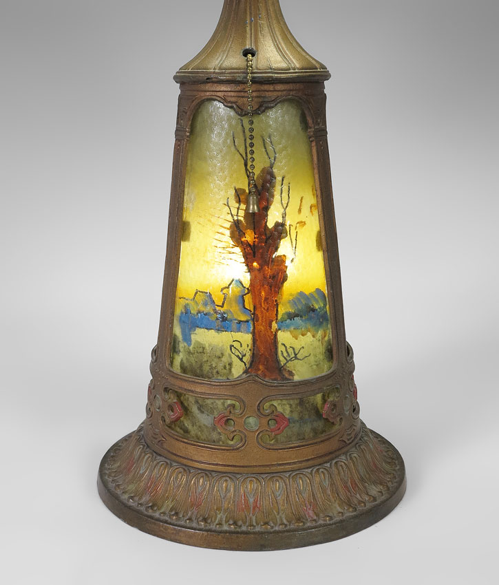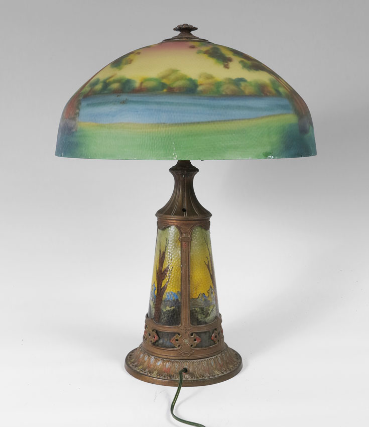 VINTAGE REVERSE PAINTED TABLE LAMP: Reverse painted shade with lake and woods motif. Cast metal base with reverse painted inserts. 22 3/4'' h. x 8 1/2'' base dia. Shade 7'' h. x 17 1/4''.