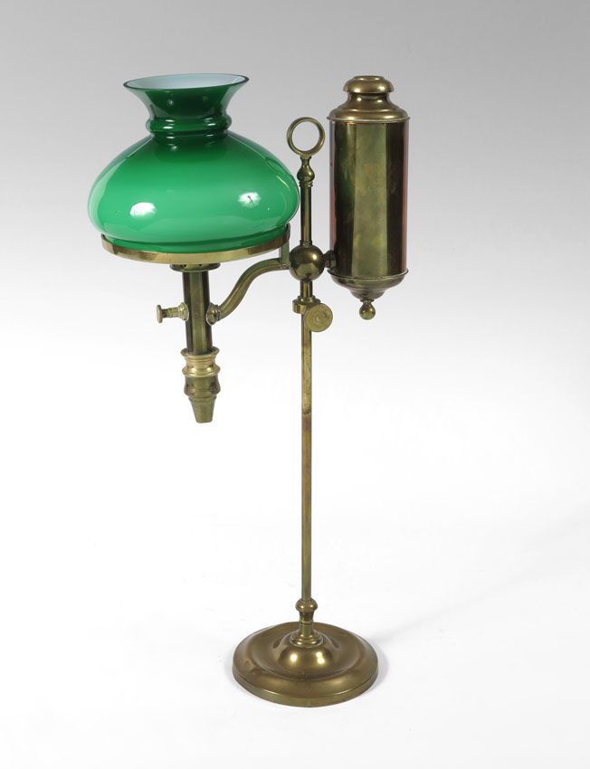 BRASS STUDENT'S LAMP: Lamp with cased green glass shade, adjustable, circa 1910, 20 1/2'' high.