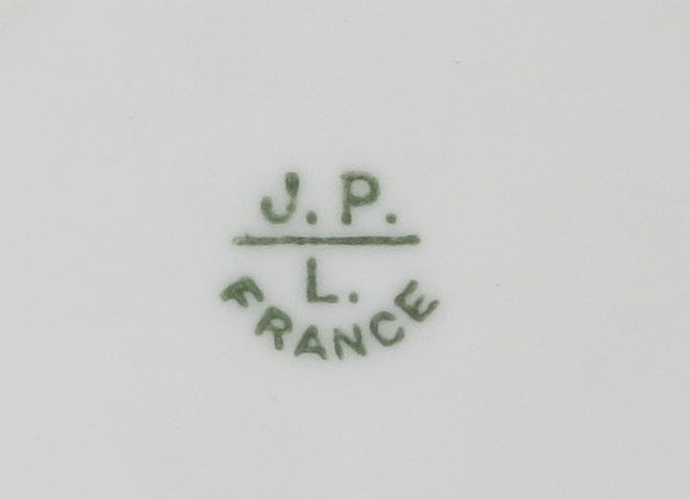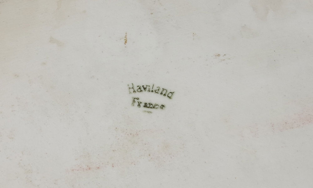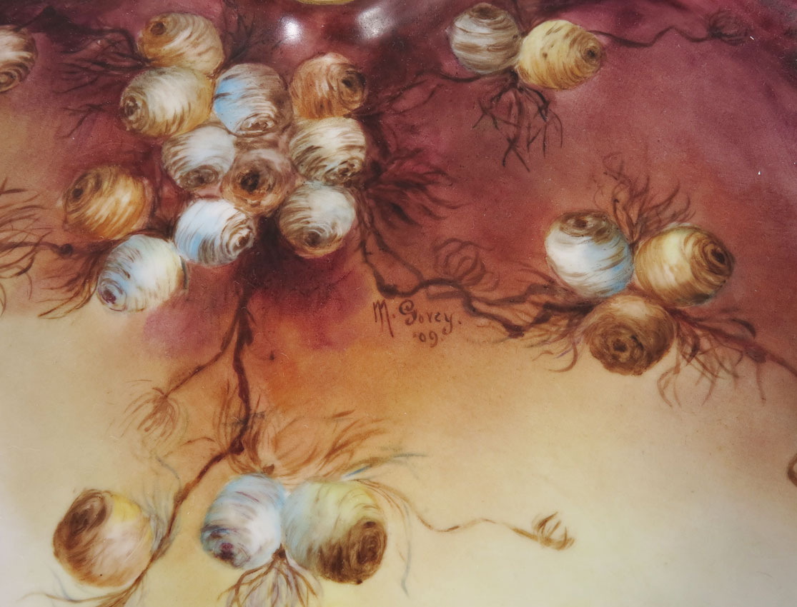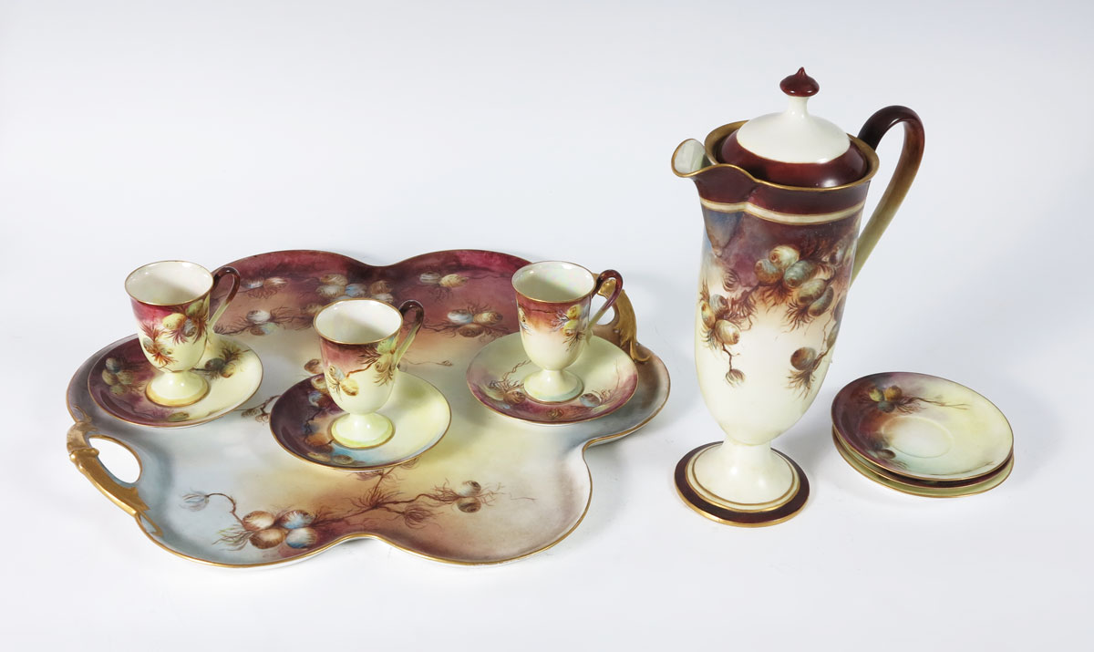 ARTIST SIGNED FRENCH LIMOGES CHOCOLATE SET ON TRAY: 11 pieces by Jean Pouyat, circa 1891-1932, in a pine cone pattern, signed M. Sorey '09 on tray. To include chocolate pot (12'' h. x 7 1/2''), 3 cups (3 3/4'' h.), 6 saucers (5''), tray (17 7/8'' x 17 5/8'').