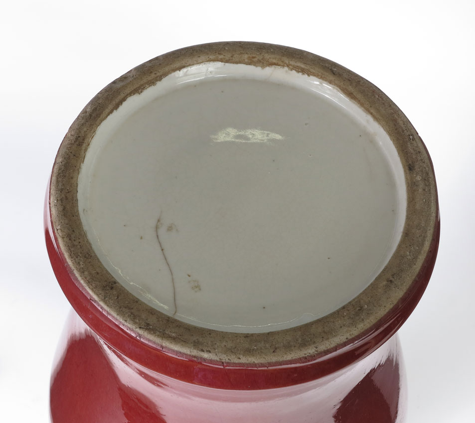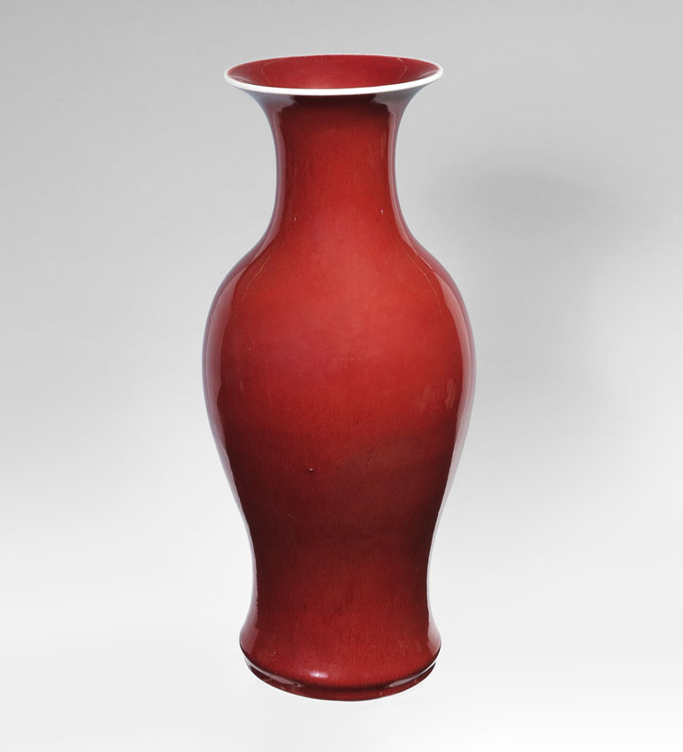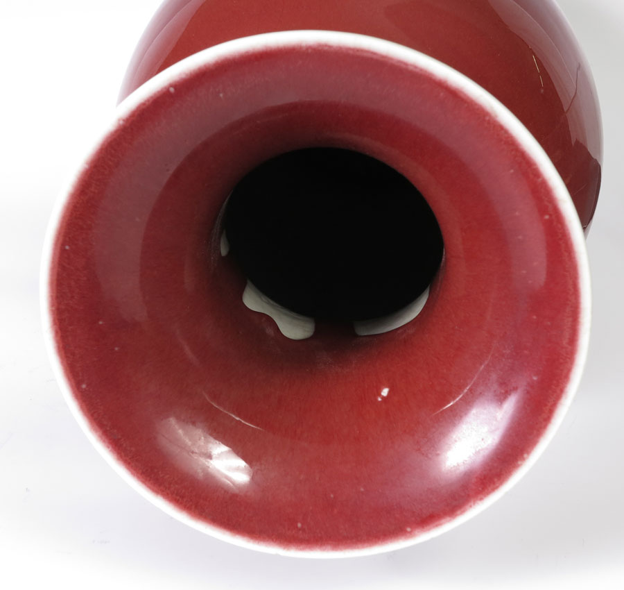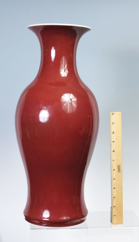 CHINESE SANG DE BOEUF PORCELAIN VASE: In baluster form, on teak stand. Vase, circa 1850, 21 1/2'' high x 9 1/2'' diameter. Actual age unknown. From the Estate of John Desmond and his wife Janina Hardoon Desmond.