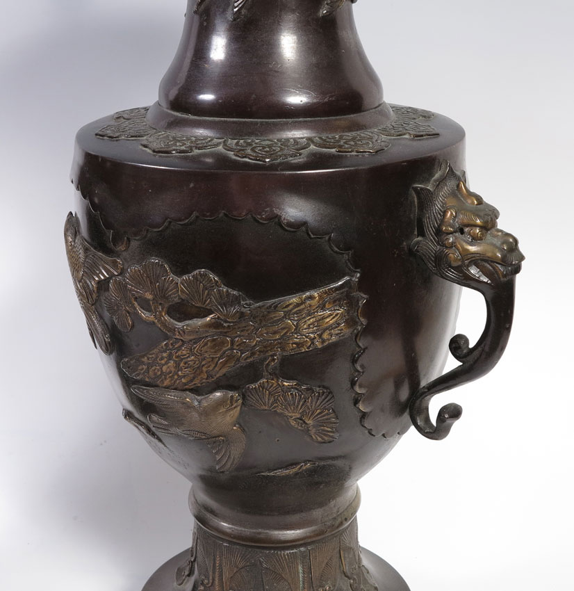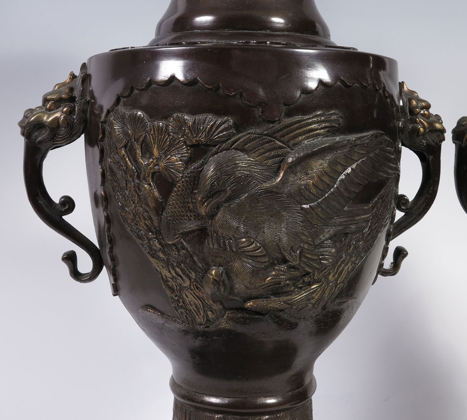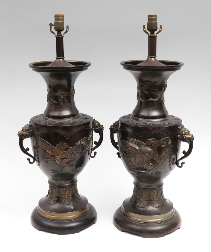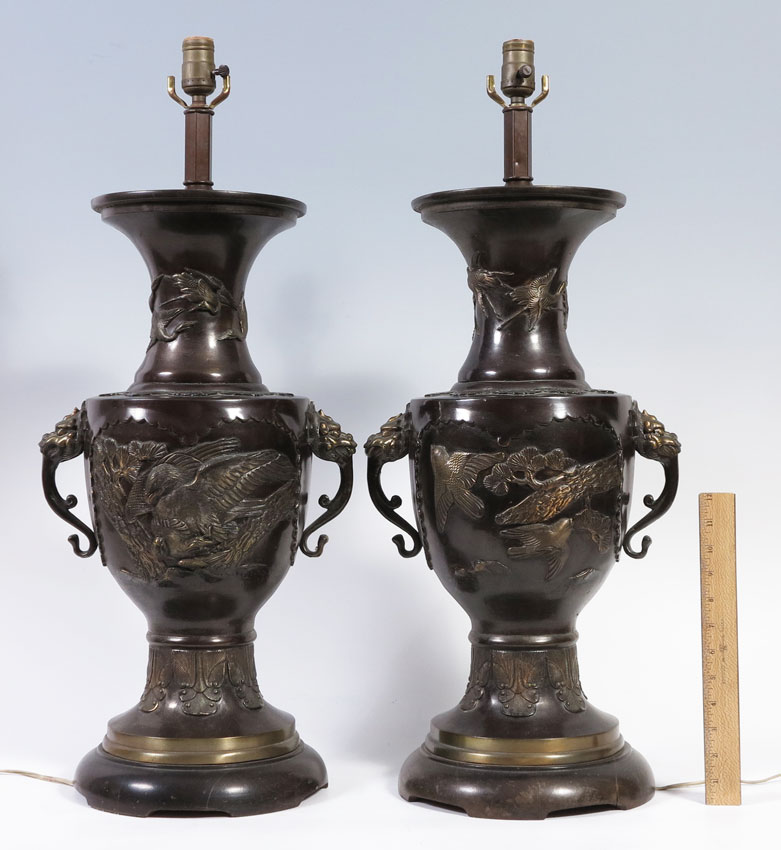 PAIR JAPANESE BRONZE LAMPS: Applied decoration of cranes, birds and eagle overtaking a smaller bird. Figural lions head handles, all on wood base. Actual age unknown. 30'' h. x 12 1/2''.